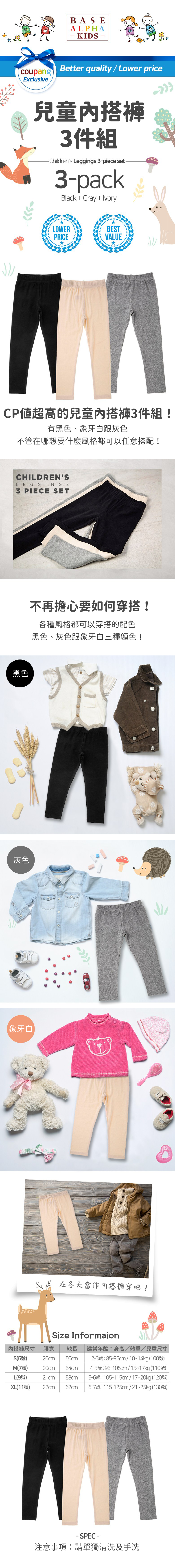BASE ALPHA ESSENTIALS兒童打底褲組,為孩子們提供舒適又百搭的穿著選擇。這款三件組包含黑色、灰色和象牙白三種顏色,採用柔軟的棉混紡材質,親膚透氣,讓孩子們在玩耍時也能感到舒適自在。彈性腰圍設計方便穿脫,不勒肚子,讓孩子們活動自如。無論是搭配裙子、短褲或長版上衣,都能輕鬆打造出不同的時尚風格。CP值超高,是媽咪們為寶貝們添購衣物的優質選擇。
