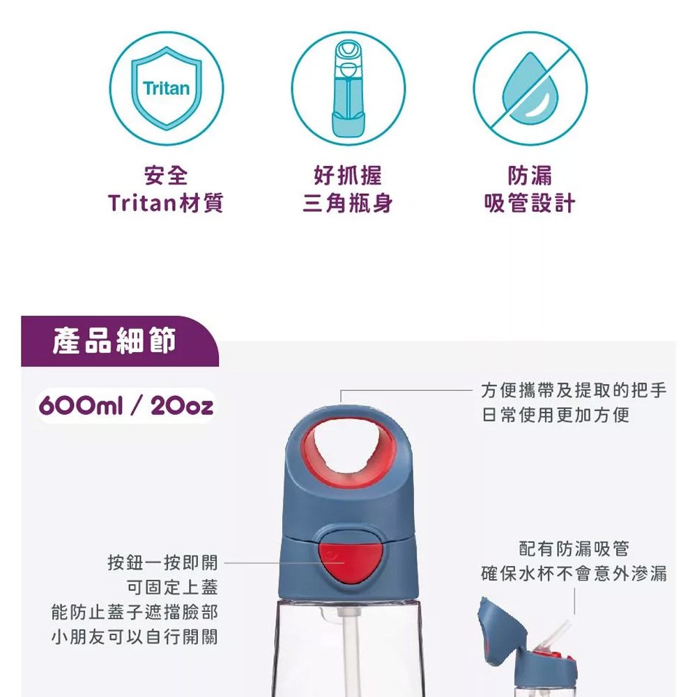 BBox Tritan 隨行水壺是一款專為孩子設計的優質水杯,不含BPA,讓孩子安心飲用。600ml容量適中,輕巧便攜,適合孩子外出或上學使用。獨特三角瓶身設計,方便孩子抓握,不易滑落。按鈕式開關設計,操作簡單,孩子可輕鬆自行打開和關閉。配有防漏吸管,確保水杯不會意外滲漏,保持清潔衛生。丁香紫配色清新可愛,讓孩子愛不釋手,增加飲水樂趣。