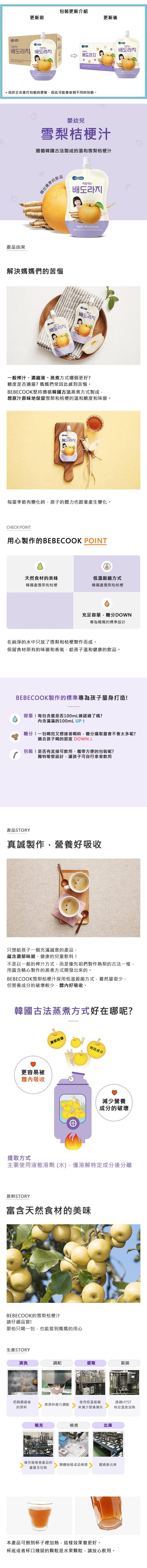 BEBECOOK 孩童桔梗水梨汁,嚴選韓國產地新鮮水梨與桔梗,遵循韓國古法蒸煮工藝,保留食材原有的清甜與營養。獨立小包裝設計,方便外出攜帶,隨時補充水分。口感溫和順口,幫助寶寶潤喉,是呵護寶寶健康的理想選擇。無添加人工色素及香料,讓寶寶喝得安心,媽媽放心。給寶寶健康又美味的飲品體驗。
