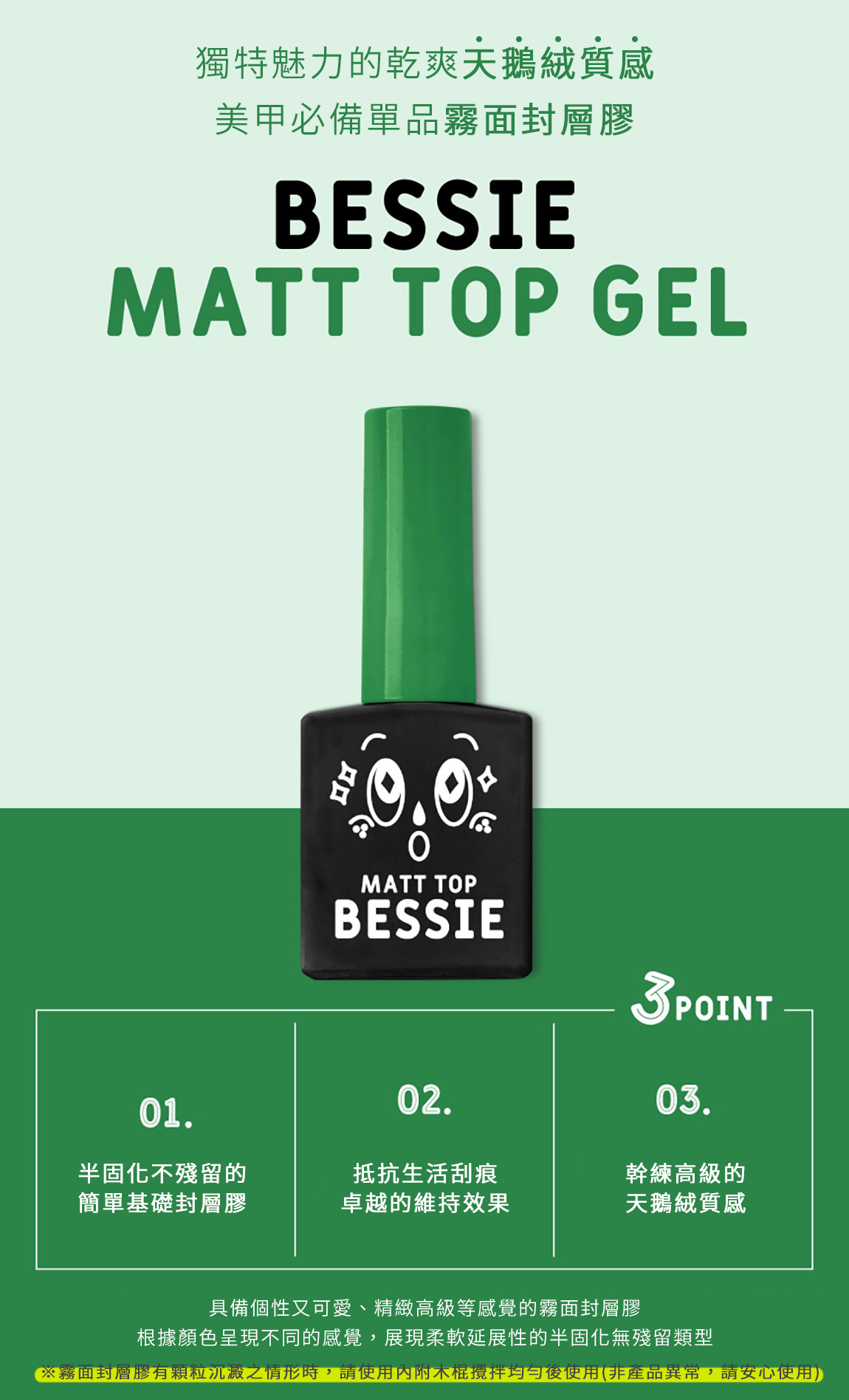BESSIE霧面上層凝膠,為您的美甲帶來獨特的天鵝絨質感。這款半固化凝膠,操作簡單,不殘留,非常適合美甲新手。它能有效抵抗生活中的刮痕,讓您的美甲持久亮麗。霧面封層膠能呈現多種風格,無論是個性、可愛還是精緻高級,都能輕鬆駕馭。使用前,若有顆粒沉澱,請用內附木棍攪拌均勻即可。