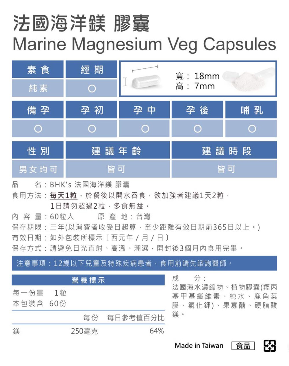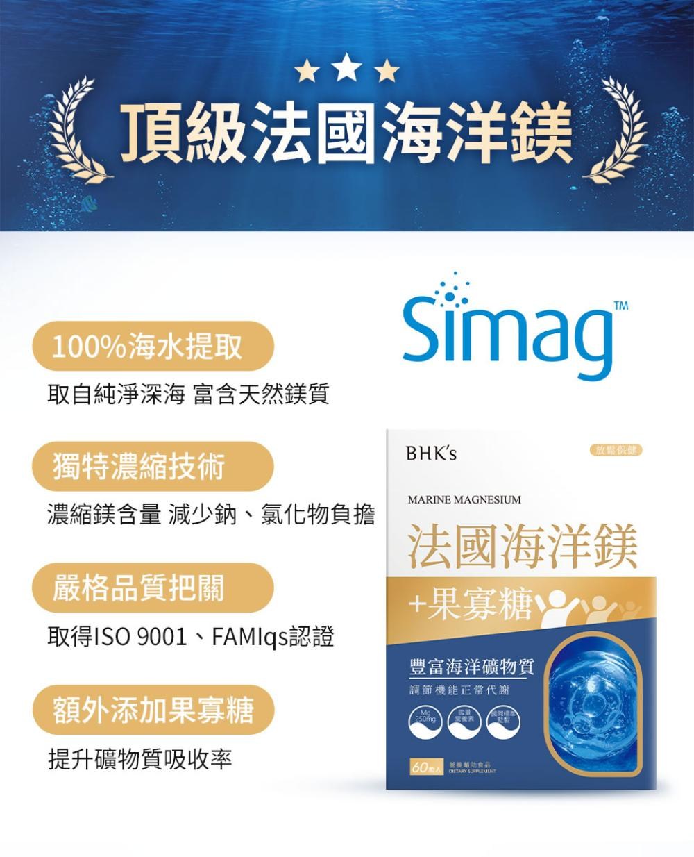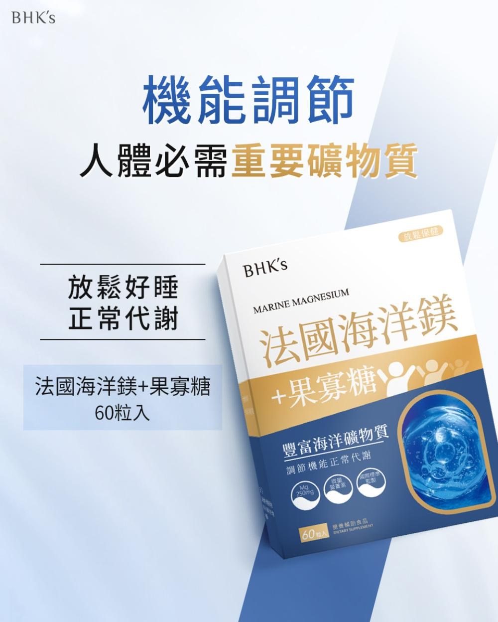 BHK's 法國海洋鎂素食膠囊,嚴選法國海洋鎂,提供豐富的鎂元素,有助於放鬆心情、幫助入睡,並維持正常的生理機能。每顆膠囊含有300mg的鎂,能滿足每日所需,並添加果寡糖,促進鎂的吸收。本產品為素食膠囊,適合不同飲食習慣的人群。鎂對於骨骼和牙齒的正常發育至關重要,同時參與人體多項生理反應,是維持健康不可或缺的營養素。