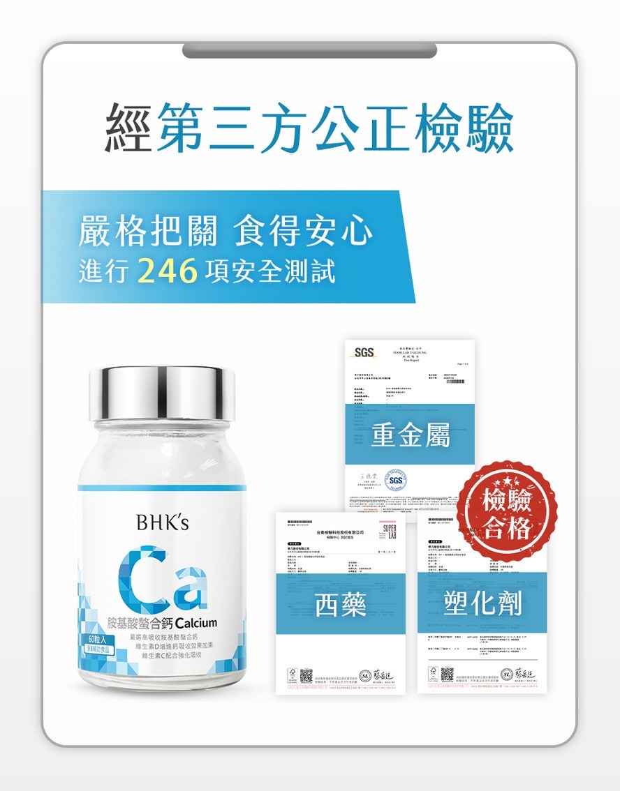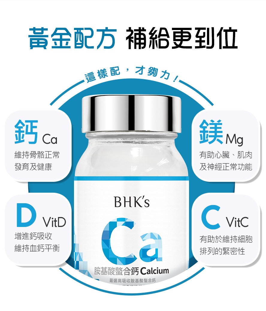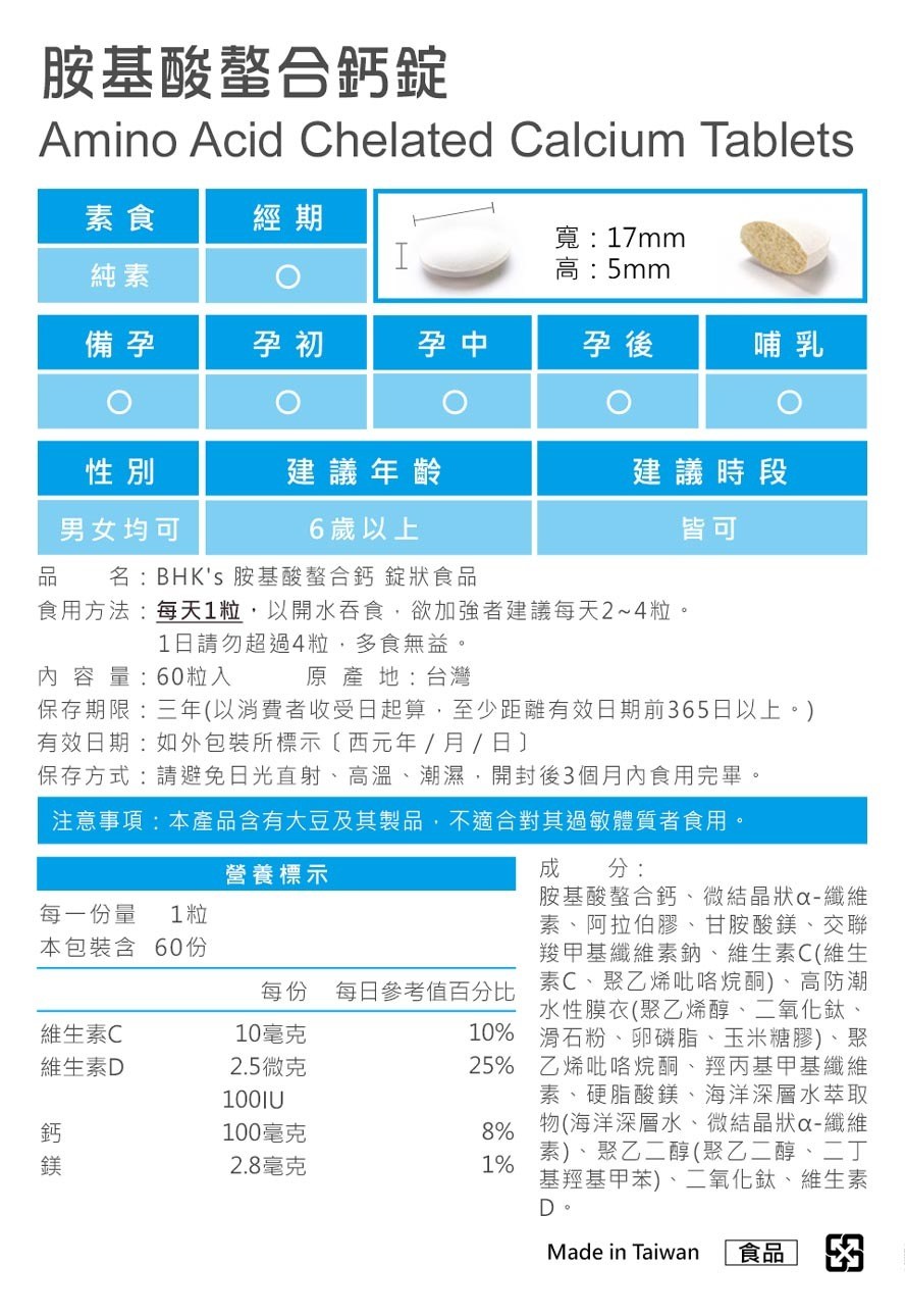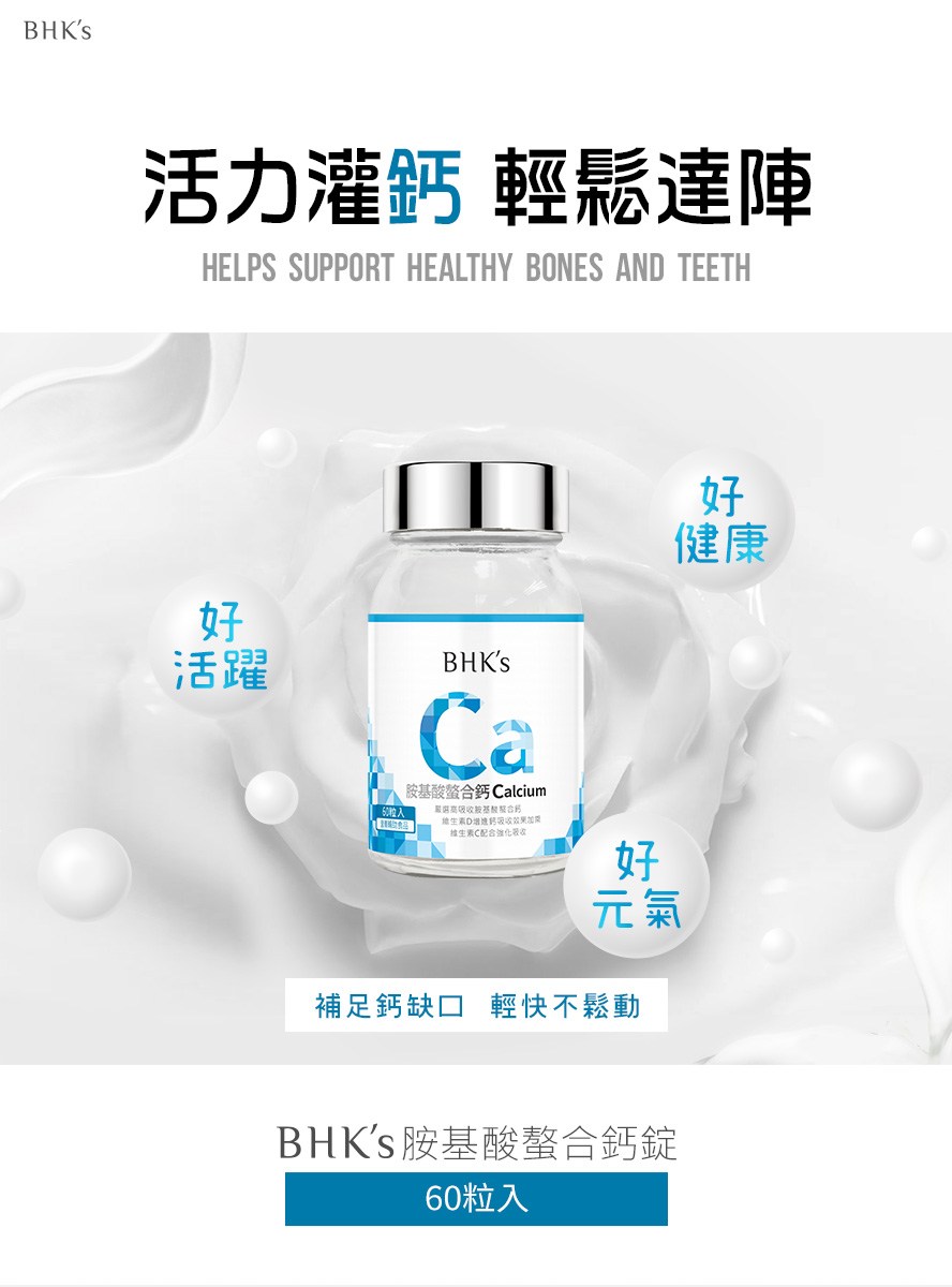 BHK'S 胺基酸螯合鈣錠,每盒60粒,為您提供關鍵靈活的健康支持。本產品採用高吸收率的胺基酸螯合鈣,更添加維生素D和維生素C,有助於增進鈣質吸收,強化骨骼健康。胺基酸螯合技術確保鈣質更容易被身體利用,適合各年齡層成人補充。選擇BHK'S,為您的健康打下堅實基礎,讓您行動自如,享受活力生活。本產品經過嚴格品質把關,讓您買得安心,吃得放心。