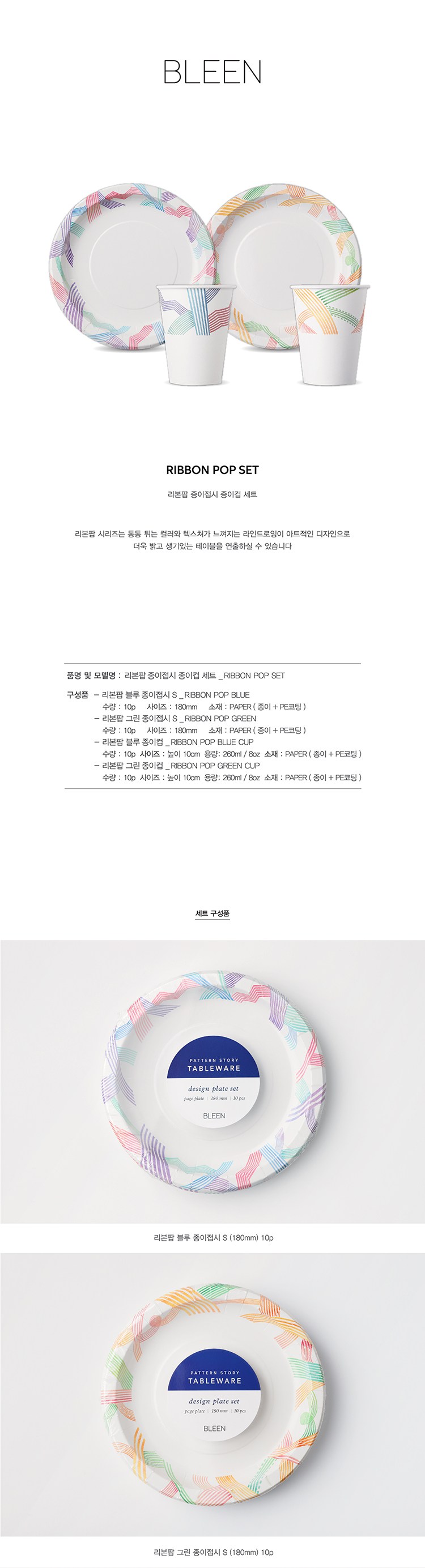 BLEEN Ribbon Pop 紙盤 藍色 180mm 10入 + 綠色 180mm 10入 + 紙杯 藍色 260ml x 10入 + 綠色 260ml x 10入, 1套