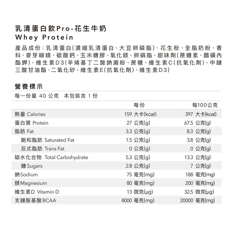 - 花生牛奶口味的乳清蛋白,口感香醇濃郁,擺脫傳統蛋白飲的乏味,讓您享受美味的同時補充營養。