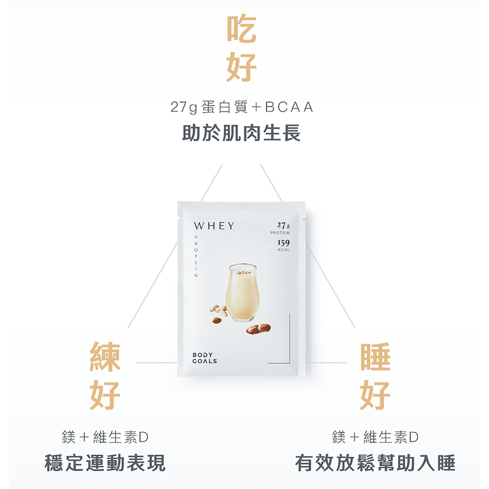 - 添加維生素D與鎂,BODY GOALS乳清蛋白有助於鈣質吸收維持神經肌肉正常生理,讓您擁有健康好體態