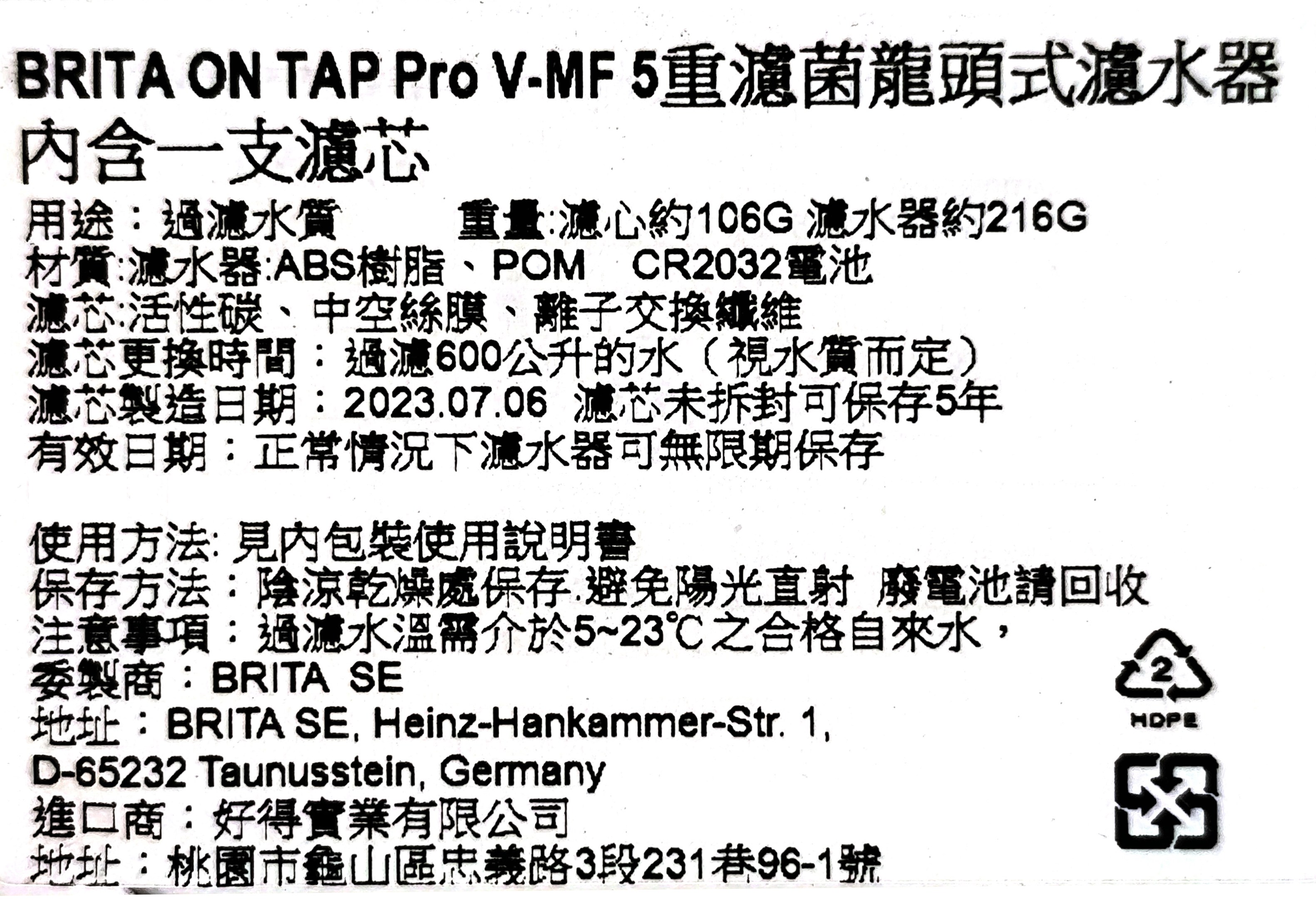 BRITA ON TAP Pro V-MF 5重濾菌龍頭式濾水器,為您提供即時、潔淨的飲用水解決方案。這款龍頭式濾水器能有效去除氯氣、雜質、微塑膠及重金屬,同時保留有益礦物質,讓您飲用更安心。其五重過濾系統確保水質純淨,而即開即用的設計,省去等待時間,隨時享受健康好水。數位顯示螢幕能即時顯示濾芯剩餘壽命,提醒您適時更換,確保最佳過濾效果。安裝簡便,適用於多數標準龍頭,讓您輕鬆擁有高品質的飲用水。