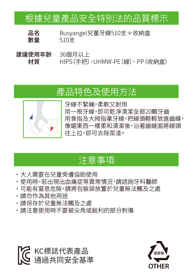 呵護寶貝的口腔健康,從小養成良好習慣!Busy Angel兒童牙線棒,專為36個月以上的兒童設計,每組包含510支牙線棒及一個收納盒,方便衛生攜帶。牙線採用柔軟且不易斷裂的400D線材製成,溫和清潔牙縫,呵護孩子稚嫩的牙齦。繽紛的色彩造型,讓孩子愛上清潔牙齒,告別蛀牙困擾。父母可在旁協助使用,確保安全,讓孩子在快樂中擁有健康笑容。