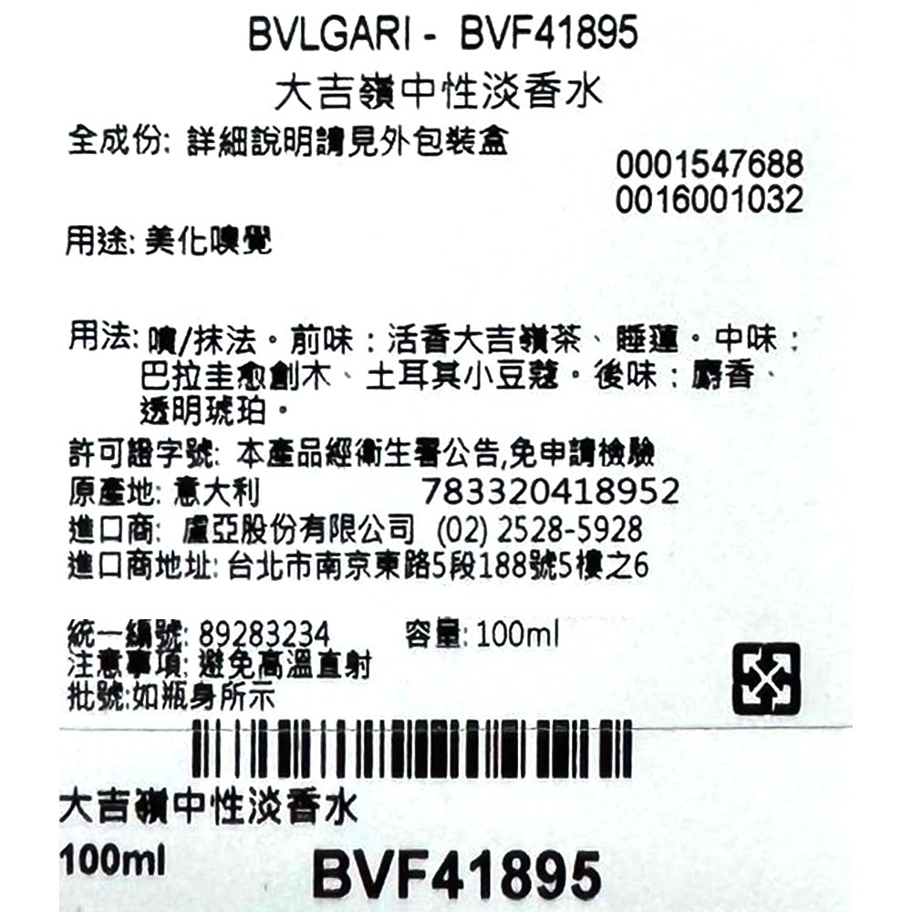 BVLGARI 寶格麗 大吉嶺中性淡香水, 1瓶, 100ml