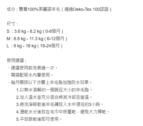 Babee Greens 美麗諾羊毛尿布兜是您為寶寶選擇天然、舒適尿布的最佳選擇。這款L尺寸的尿布兜,適用於9~16公斤的寶寶,採用雙層100%美麗諾羊毛製成,通過Oeko-Tex 100認證。美麗諾羊毛具有極佳的透氣性和吸濕性,能有效保持寶寶皮膚乾爽,減少紅屁屁的發生。此外,能抑制細菌滋生,保護寶寶的健康。這款尿布兜重量僅155克,輕巧舒適,讓寶寶活動自如。