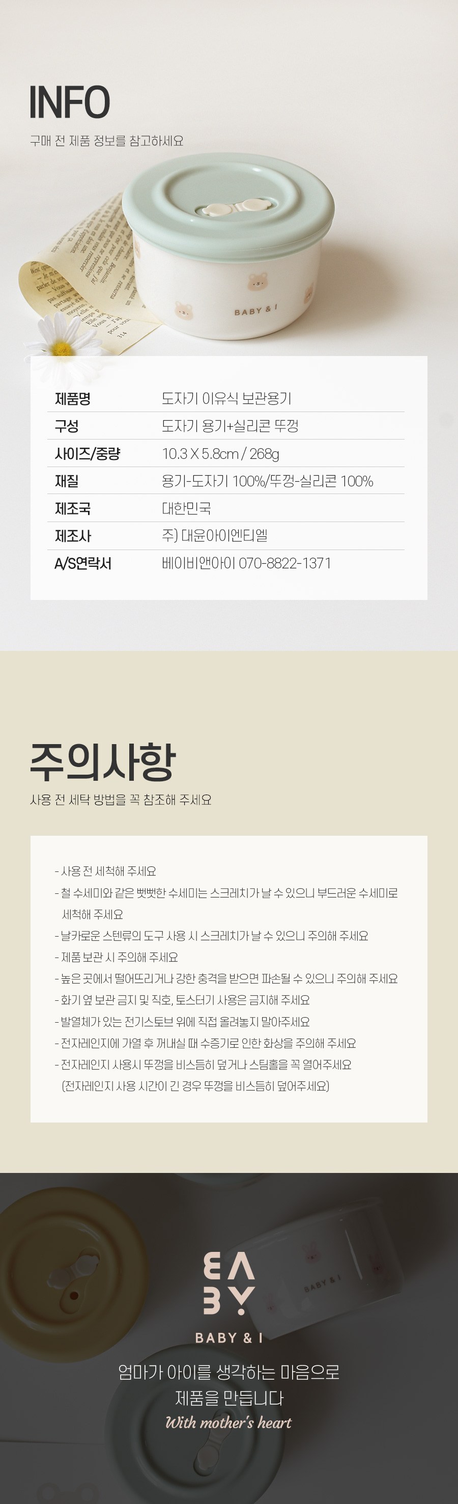 經過三次燒製,堅固耐用,不易損壞。特殊的密封設計,即使外出攜帶也不易滲漏。盒內刻度清晰可見,方便媽媽們精準掌握寶寶的飲食量。本產品為韓國製造,品質安心有保障。