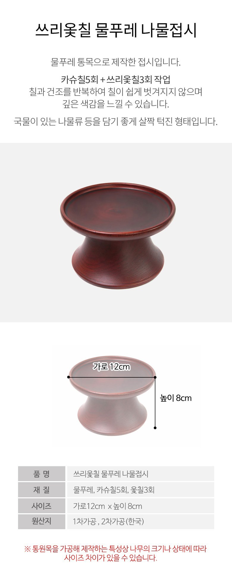 朴氏商房三漆灰菜盤,傳遞韓國傳統精神與香氣。此菜盤以堅硬白蠟木原木製成,木紋清晰可見,並保留原木的自然黑點,呈現獨特質感。經過五次腰果漆與三次面漆的繁複工序,漆面不易脫落,色澤深邃。盤面設計略帶邊緣,方便盛裝帶湯汁的野菜料理。一次加工與二次加工皆在韓國完成,為您的餐桌增添一份傳統美感。
