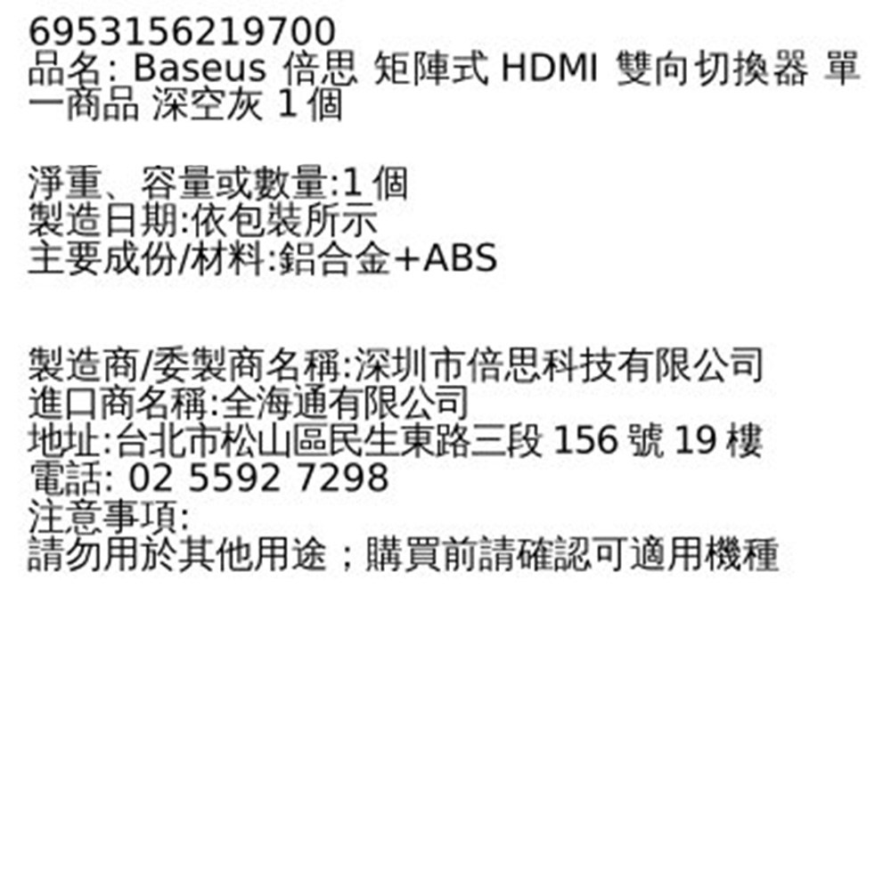Baseus矩陣式HDMI雙向切換器讓您輕鬆切換多個HDMI設備,享受流暢的影音體驗。這款切換器支援雙向切換,無論是將一個訊號源分配到多個顯示器,還是將多個訊號源切換到一個顯示器,都能輕鬆應對。深空灰配色時尚簡約,完美融入您的影音設備環境。支援高達4K的解析度,確保影像清晰細膩。告別頻繁插拔線纜的煩惱,享受便捷高效的影音生活。