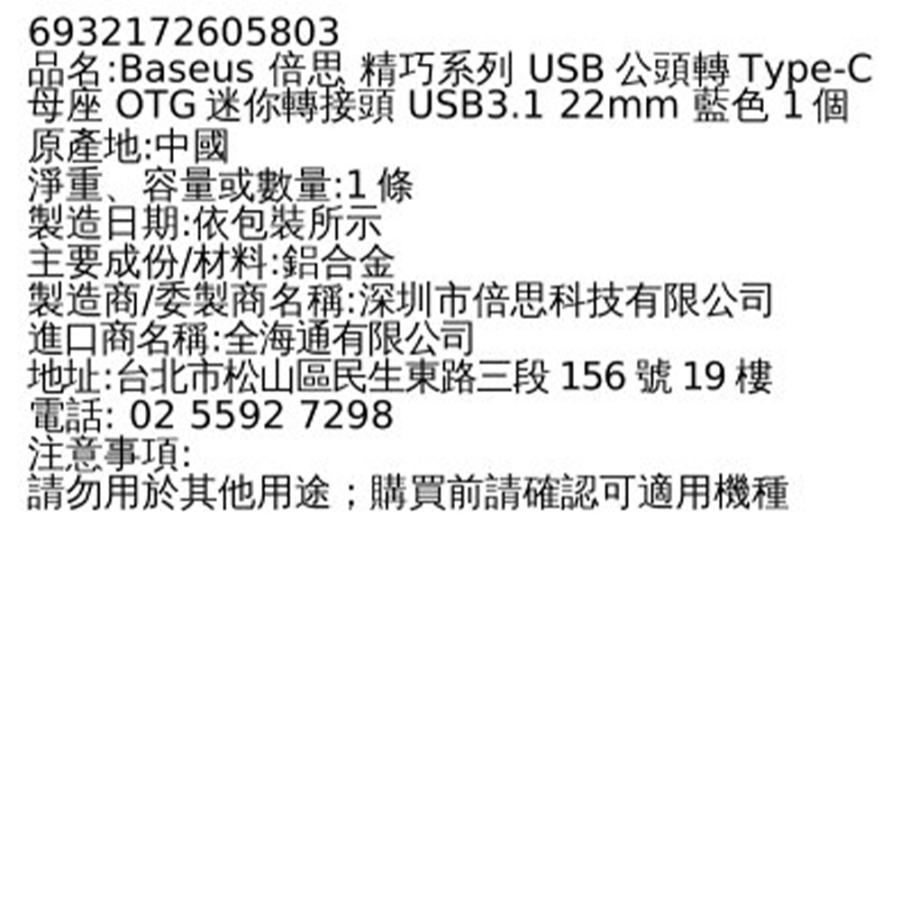Baseus精巧系列USB公頭轉Type-C母座OTG迷你轉接頭,讓您的設備連接更加靈活方便。這款藍色轉接頭支援USB 3.1高速傳輸,確保資料同步快速穩定。迷你輕巧的設計,方便攜帶,隨時隨地解決連接問題。適用於多種設備,如手機、平板等,實現USB設備與Type-C設備之間的無縫連接。無論是資料傳輸還是充電,Baseus轉接頭都能滿足您的需求,提升您的使用體驗。