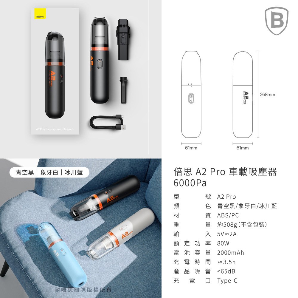 Baseus 倍思 A2 Pro 車載吸塵器,讓您的愛車時刻保持潔淨。這款無線手持吸塵器擁有高達 6000pa 的強勁吸力,輕鬆應對車內灰塵、碎屑及毛髮。HEPA 濾網有效過濾微小顆粒,保障車內空氣清新。配備二合一吸嘴,深入清潔縫隙死角,附贈收納袋和 Type-C 充電線,方便收納和充電。簡約白色外觀,時尚輕巧,是您車內清潔的理想之選。