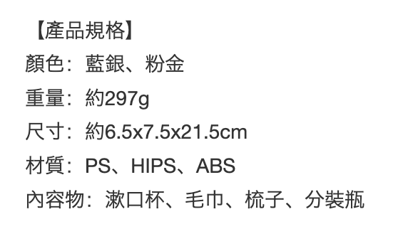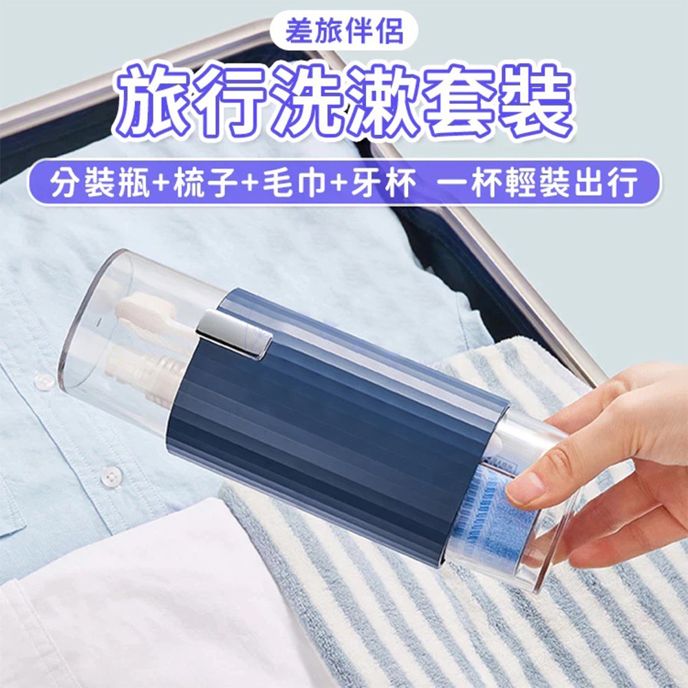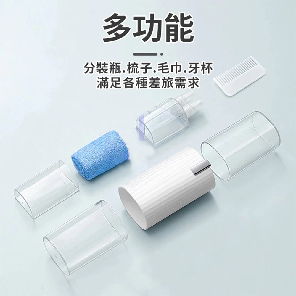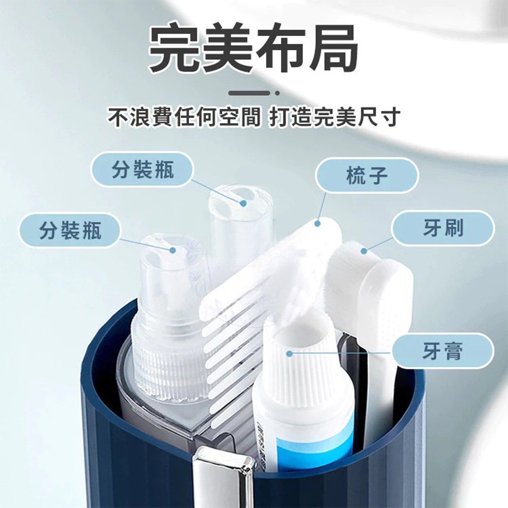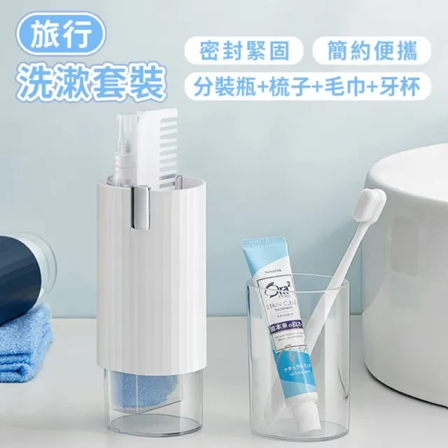 - 多功能整合設計,包含漱口杯、柔軟毛巾、梳子和分裝瓶,一次滿足您的所有盥洗需求。