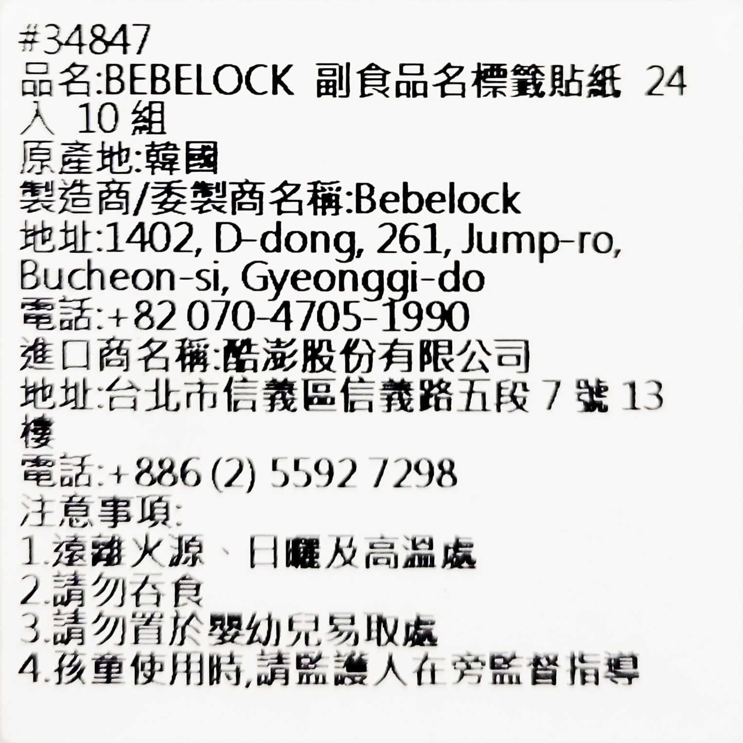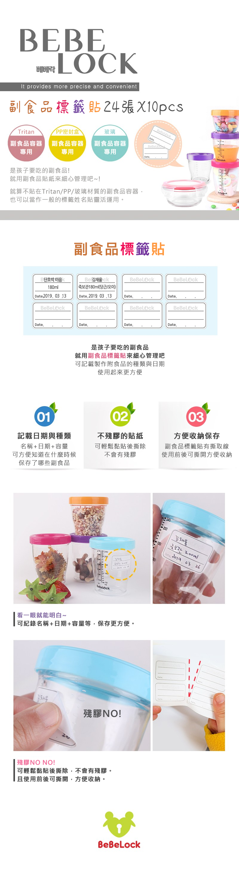 BeBeLock副食品標籤貼是管理寶寶副食品的理想選擇。這款標籤貼可以清楚記錄副食品的種類、日期和容量,讓您隨時掌握寶寶的飲食狀況。採用不殘膠材質,輕鬆黏貼且撕除後不留痕跡,方便清潔。每包含十張貼紙,每張有24枚,混色設計,適用於各種材質的副食品容器,讓您輕鬆管理寶寶的健康飲食。