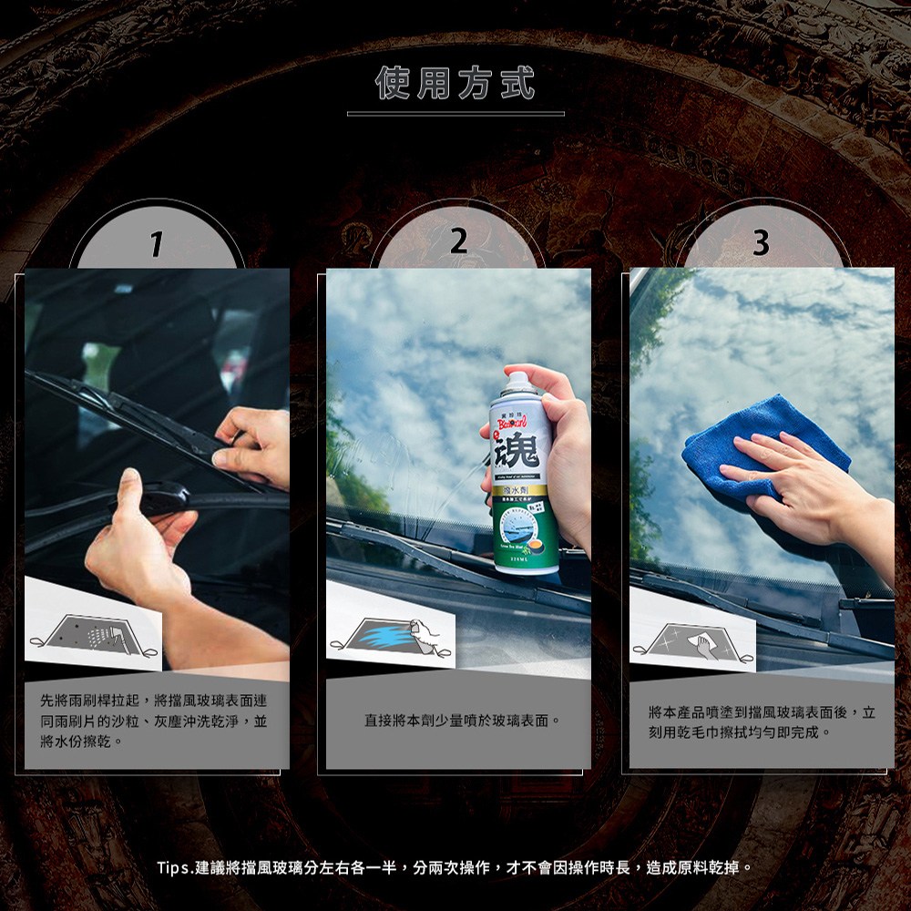 - 快速形成撥水保護膜,讓水珠不易附著,視線清晰不模糊。