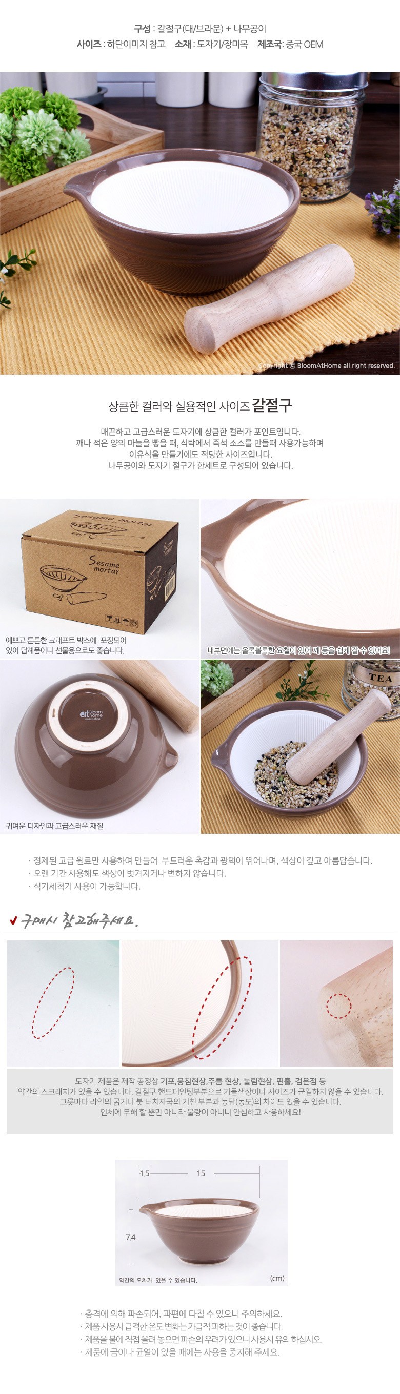 Bloom at home 陶瓷棕色磨缽,採用光滑高級的陶瓷搭配清爽顏色,內側有凹凸紋路,輕鬆研磨芝麻等食材。尺寸實用,可用於搗碎少量大蒜、製作醬料,也適合製作嬰兒副食品。木杵與陶瓷研缽為一套,包裝在美觀堅固的牛皮紙盒中,適合做為禮物。陶瓷製品製作過程可能會有輕微刮痕,不影響使用,請使用。使用後可使用洗碗機清洗,方便清潔。