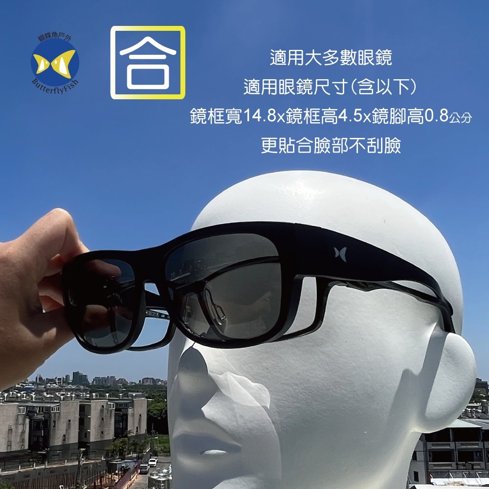 ButterflyFish 蝴蝶魚 OTG 外掛式套鏡,專為需要同時佩戴近視眼鏡的運動愛好者設計。這款套鏡尺寸為14.8 x 4.5 x 0.8公分,重量僅22克,輕巧不造成負擔。採用寶麗來偏光鏡片,有效阻擋眩光,提供清晰視野,讓您在戶外運動時也能享受舒適的視覺體驗。外掛式設計適用於大多數眼鏡尺寸,讓您無需更換眼鏡即可輕鬆使用。通過CNS15067國家太陽眼鏡測試,抗UV400,是您戶外運動的最佳選擇。