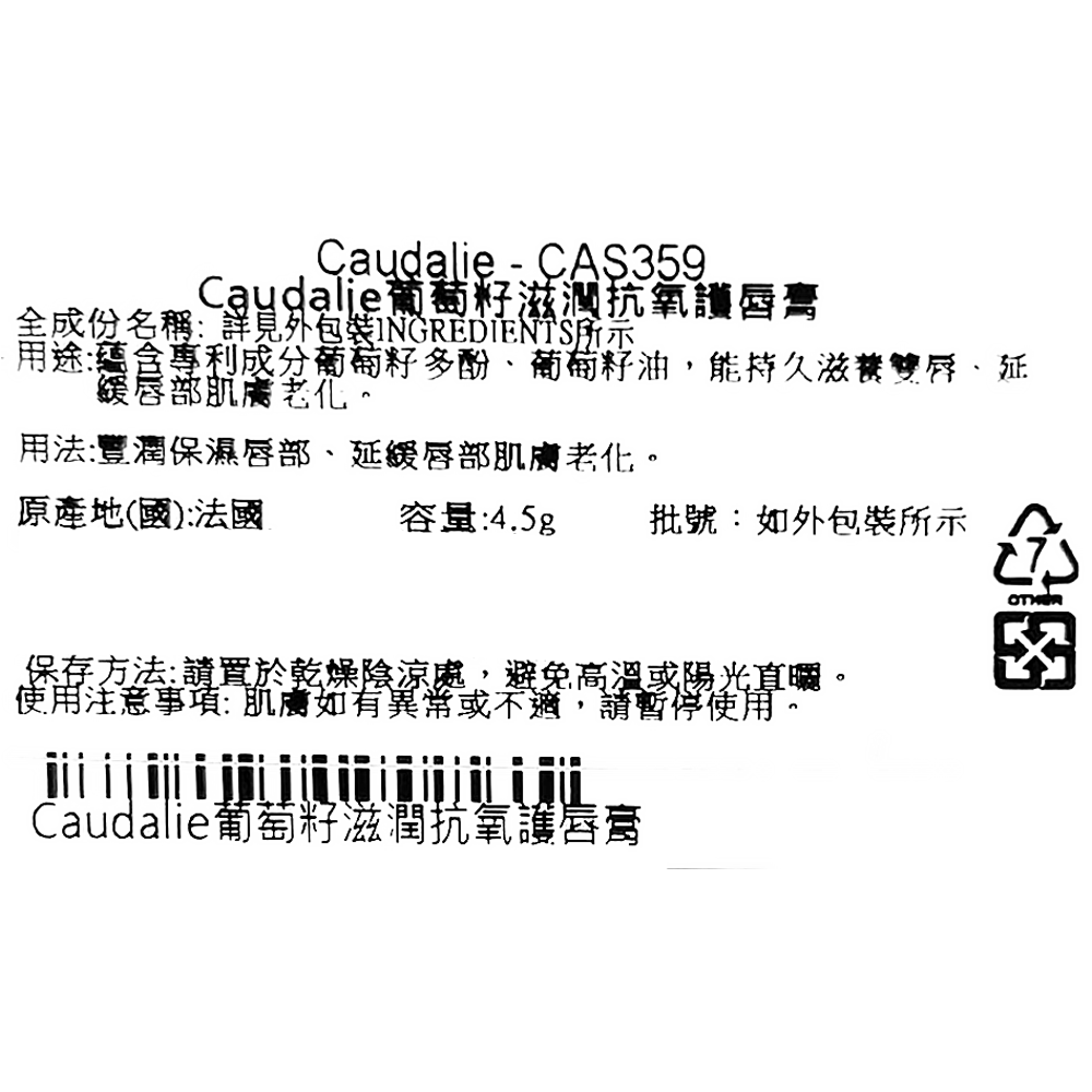 贈品CAUDALIE 歐緹麗 葡萄籽滋潤抗氧護唇膏, 葡萄, 4.5g, 1個