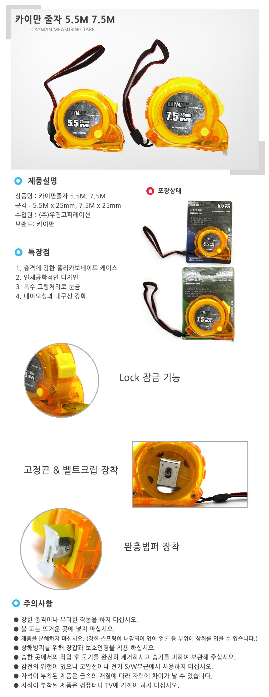 CAYMAN 7.5米捲尺是您工作上的好幫手。採用抗衝擊的聚碳酸酯外殼,堅固耐用,不易損壞。人體工學設計提供舒適的握持感。特殊塗層處理的刻度,讀數清晰,測量更精準。配有鎖定功能、固定帶和皮帶夾,方便攜帶和使用,是專業人士和DIY愛好者的理想選擇。