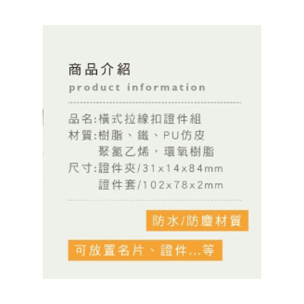 CCHING 青青文具橫式拉線扣證件組,是您辦公室或學校的理想選擇。橫式設計方便展示識別證,拉線扣讓您輕鬆刷卡,無需取下證件,提升效率,為您的工作或學習生活增添趣味。耐用材質保護證件,確保重要資訊安全。適用於各種場所,是實用又時尚的證件套。