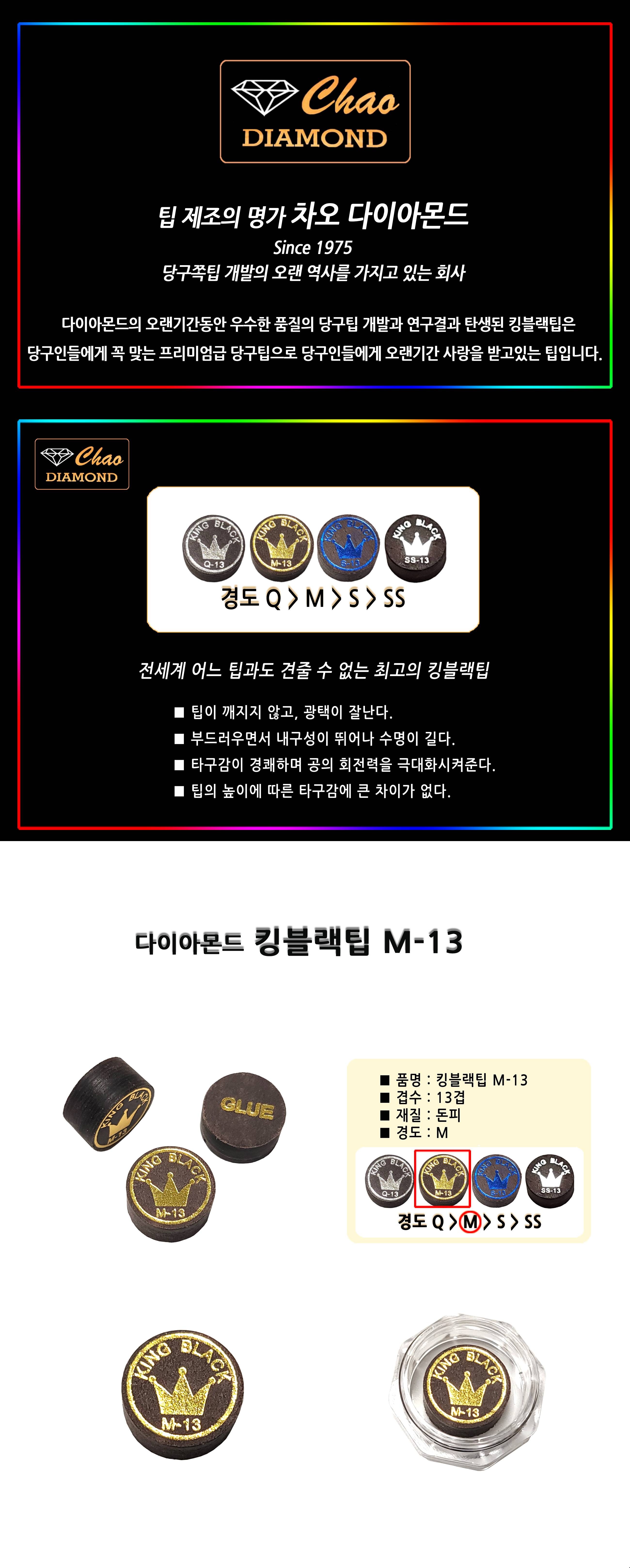 Chao Diamond King Black M-13 撞球桿頭,採用優質豬皮製成,提供卓越的性能和耐用性。其13層結構設計,確保擊球時的穩定性和一致性,讓您能更精準地控制母球。King Black 桿頭不易碎裂,光澤度佳,柔軟且耐用性強,使用壽命長。擊球感輕快,能將球的旋轉力最大化,是撞球愛好者的理想選擇。混色設計更增添個性化風格。