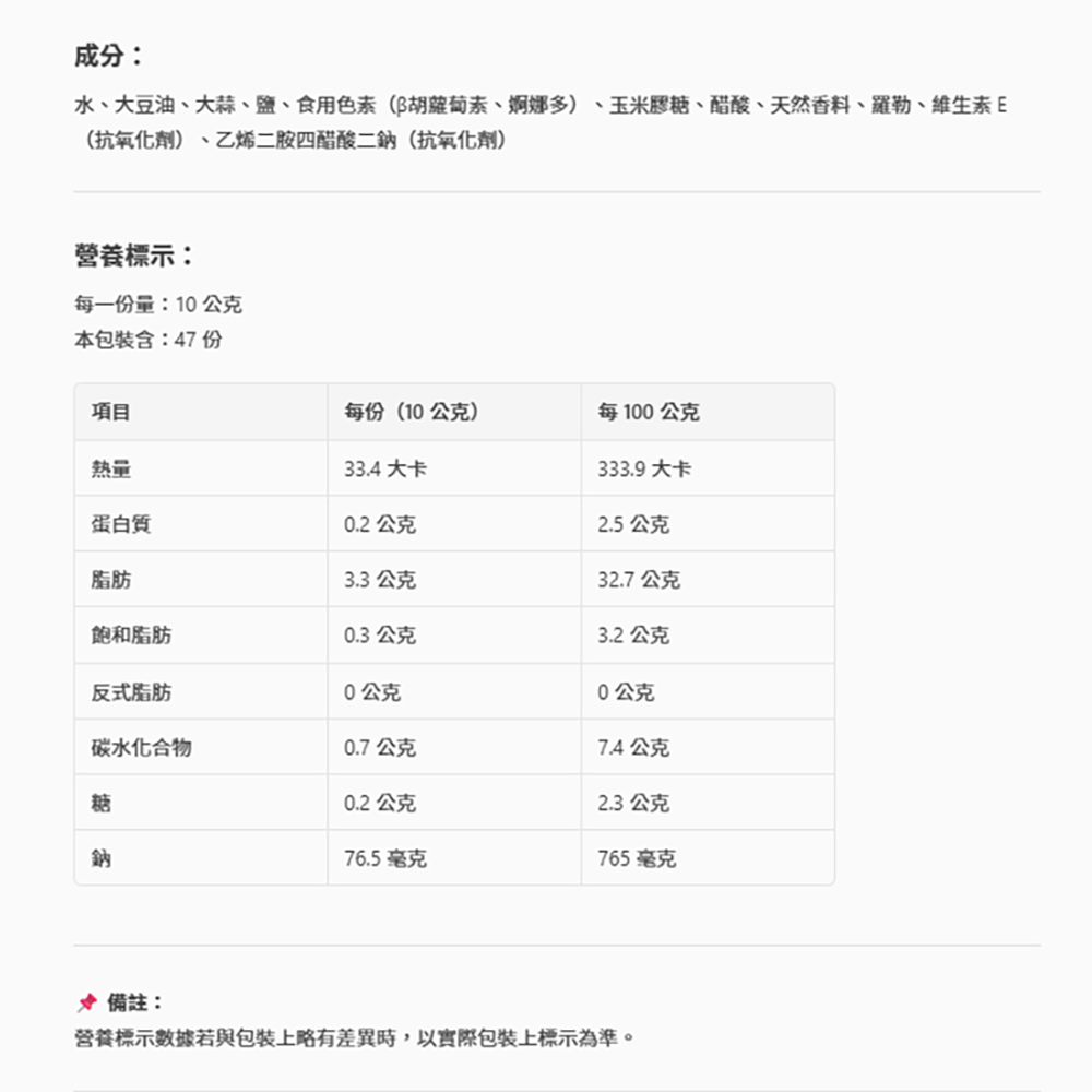 - 嚴選優質大蒜,搭配獨家配方,呈現出濃郁且多層次的蒜香風味。