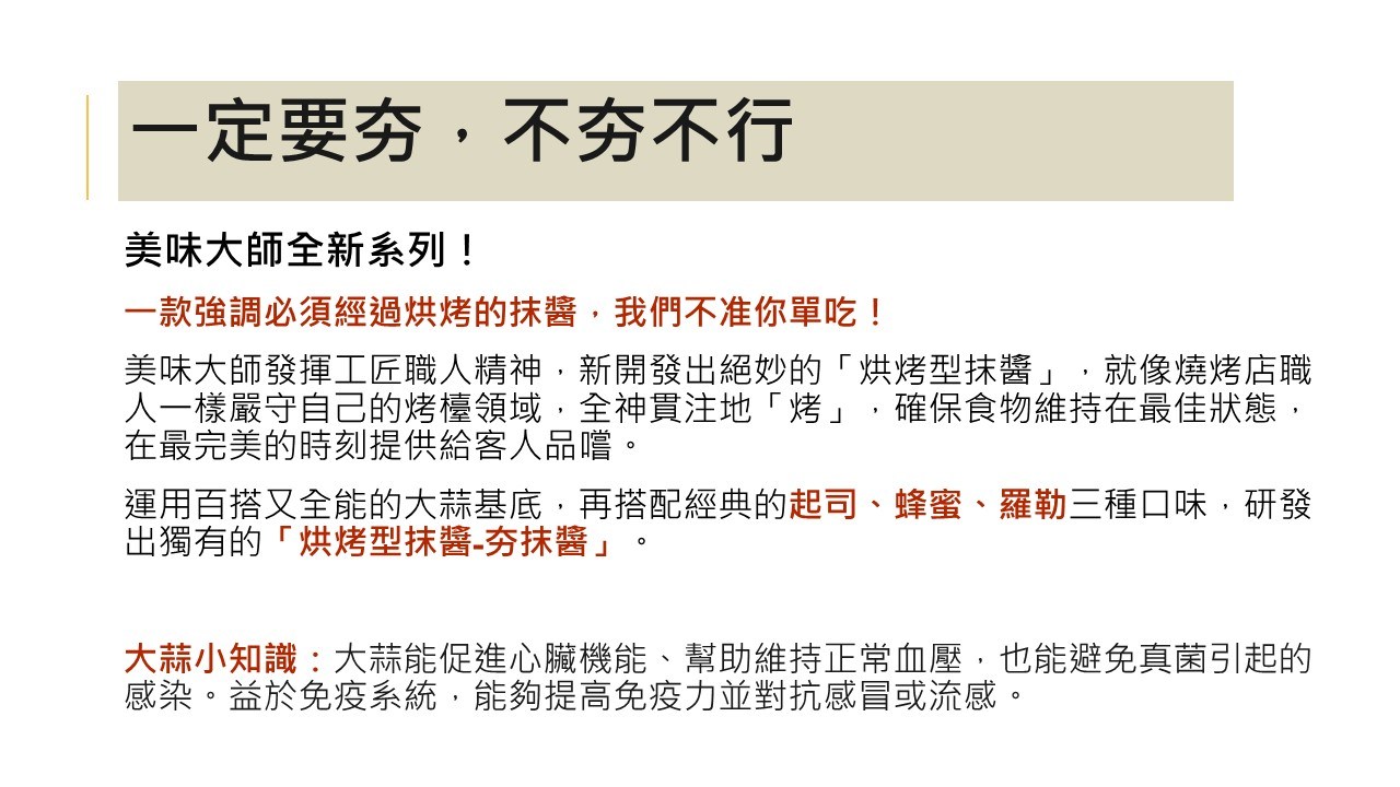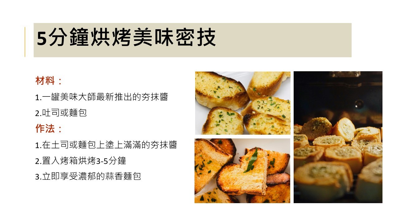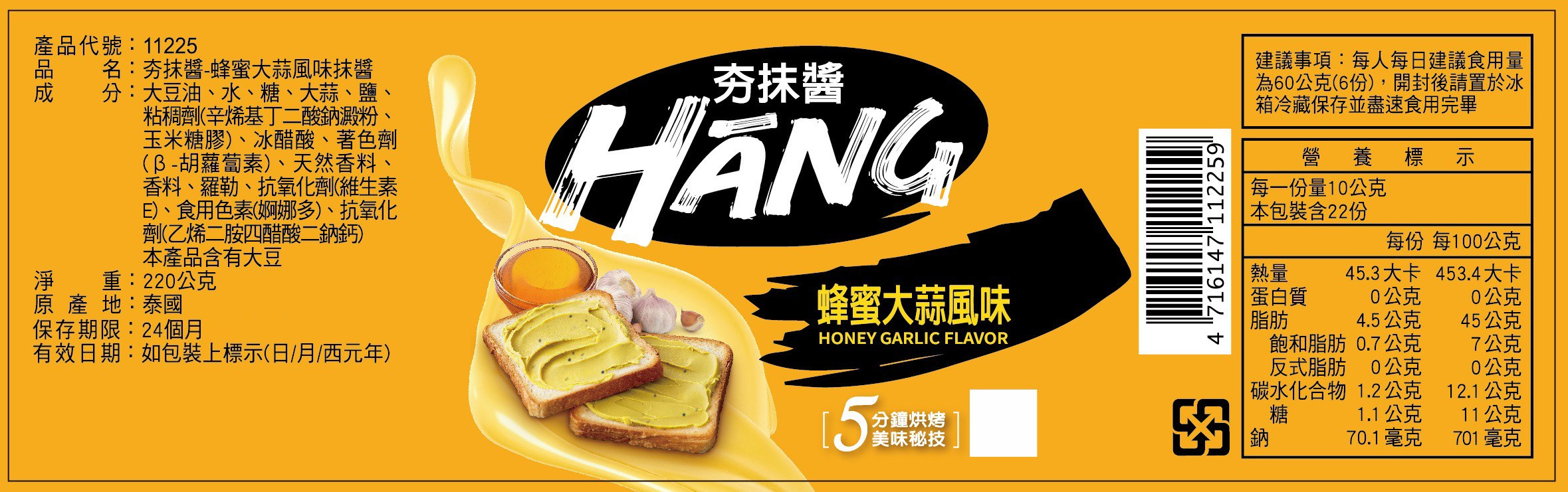 - 美味大師夯抹醬,嚴選食材用心製作,蜂蜜的香甜與大蒜的辛香,交織出令人驚豔的風味。