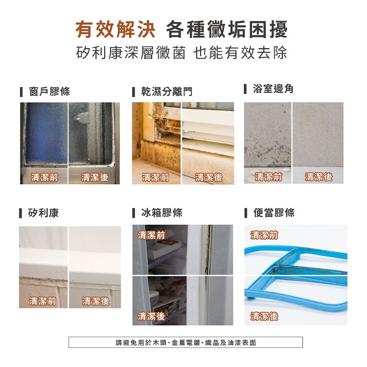 - 浴室、廚房霉菌無所遁形,深層清潔磁磚縫隙,有效去除霉斑,還原亮白表面,清潔效果看得見。