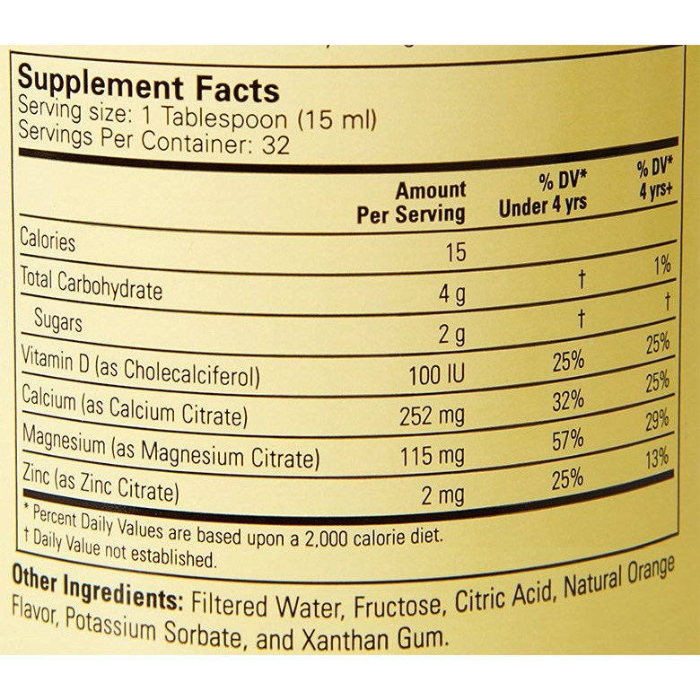 액상 칼슘 식이 보조제입니다. 1인분 당 15칼로리, 비타민 D, 칼슘, 마그네슘, 아연을 제공합니다. 카제인, 알코올, 우유, 계란, 밀, 이스트, 옥수수, 인공 색소, 향료, 감미료가 첨가되지 않았습니다.