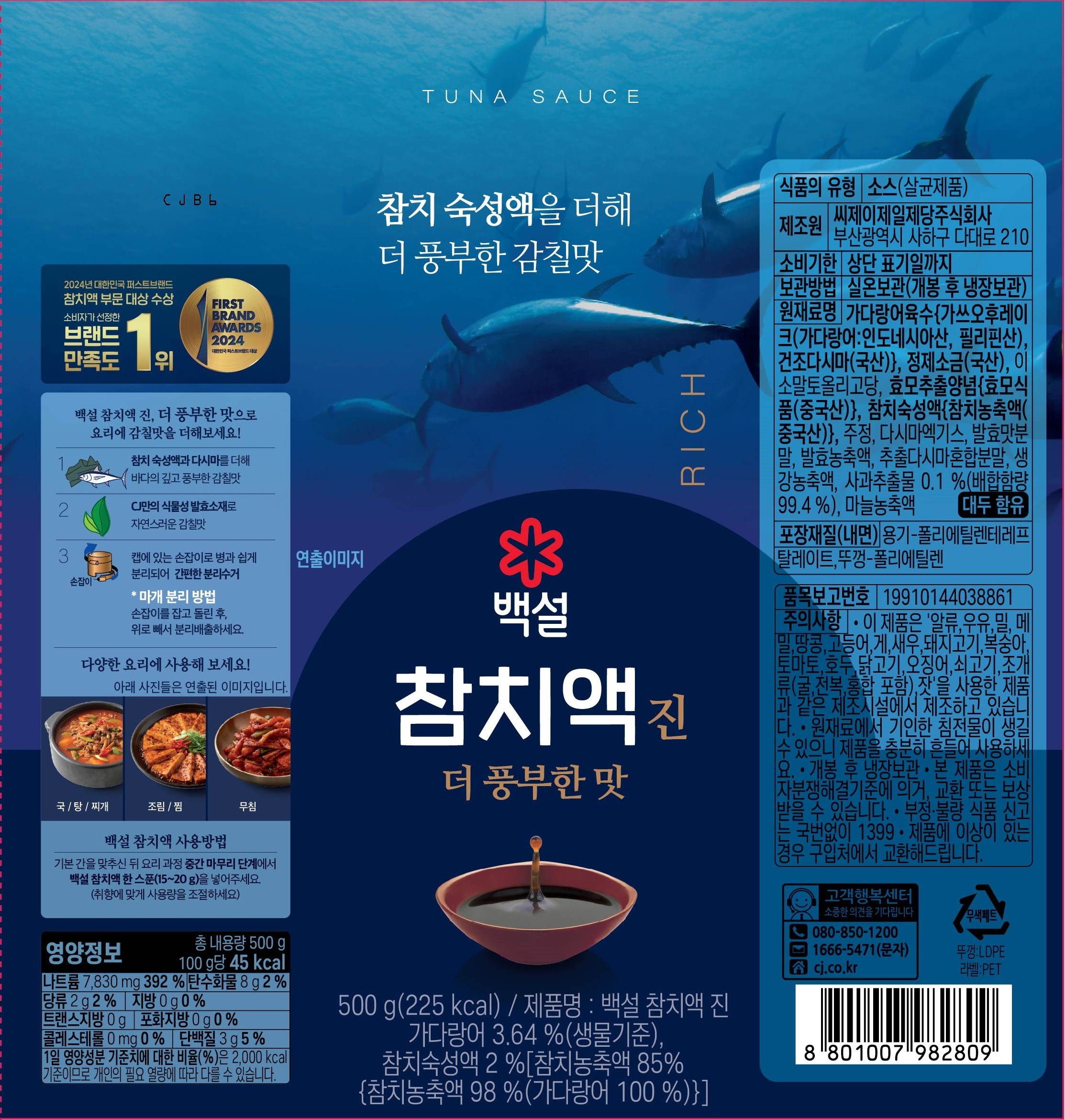 CJ BEKSUL 白雪鮪魚露,採用獨特的鮪魚熟成液,為您的料理帶來更深層次的鮮味。搭配韓國產昆布精華,讓湯頭更加濃郁,風味更佳。無論是日常的湯品、燉菜,還是需要提鮮的拌炒料理,只需加入一匙,就能輕鬆提升料理的美味度。去除腥味,保留食材原味,讓您在家也能輕鬆做出專業級的美味料理。白雪鮪魚露是您廚房中不可或缺的調味好幫手,讓您的每一道菜都充滿驚喜。