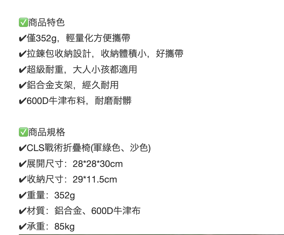 這款CLS戰術迷你折疊椅是您戶外活動的理想選擇。重量僅352克,輕巧便攜,讓您隨時隨地都能輕鬆休息。採用堅固耐用的鋁合金支架和600D牛津布,確保長時間使用不易損壞。展開尺寸為28*28*30公分,提供舒適的座位空間,收納尺寸僅29*11.5公分,方便收納於背包或車內。無論是露營、野餐還是釣魚,這款承重85公斤的折疊椅都能滿足您的需求。顏色隨機出貨,為您的戶外生活增添一份驚喜。