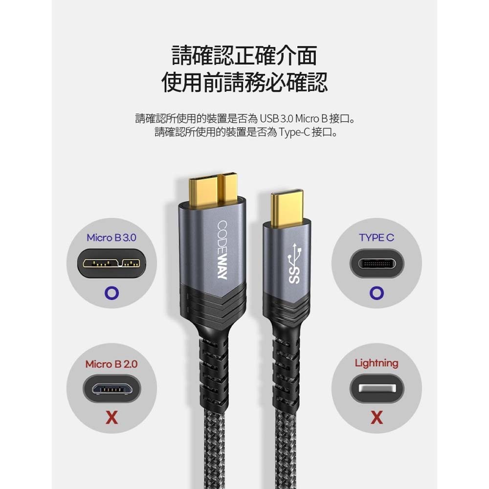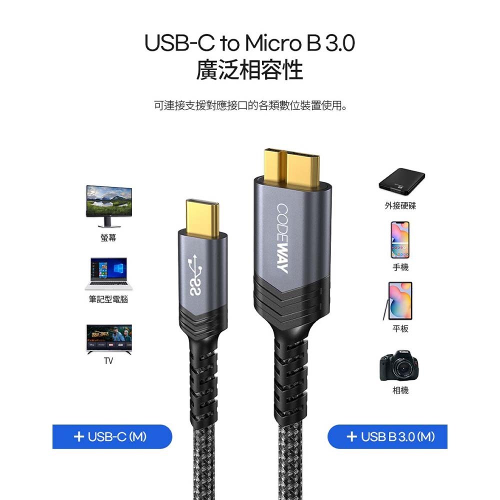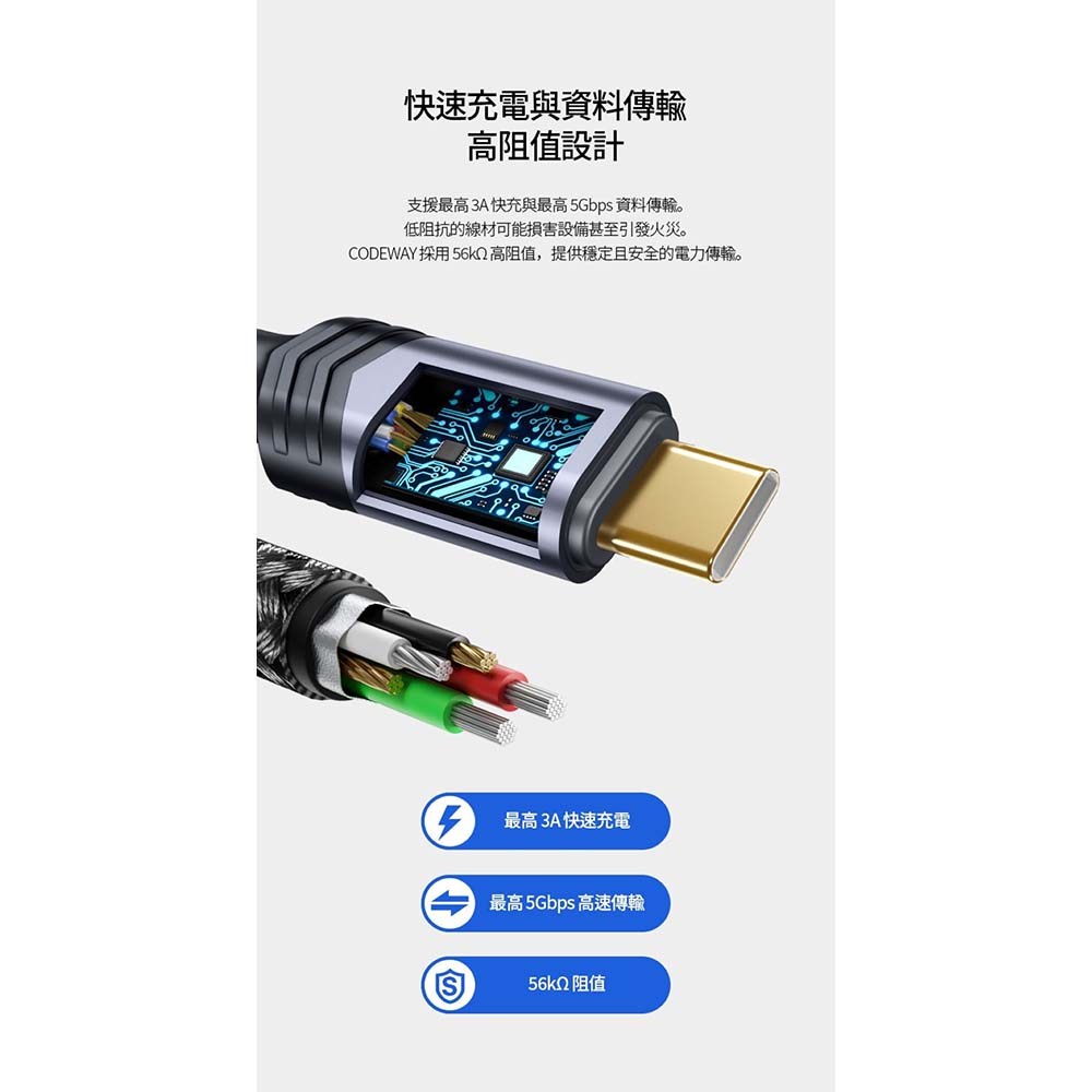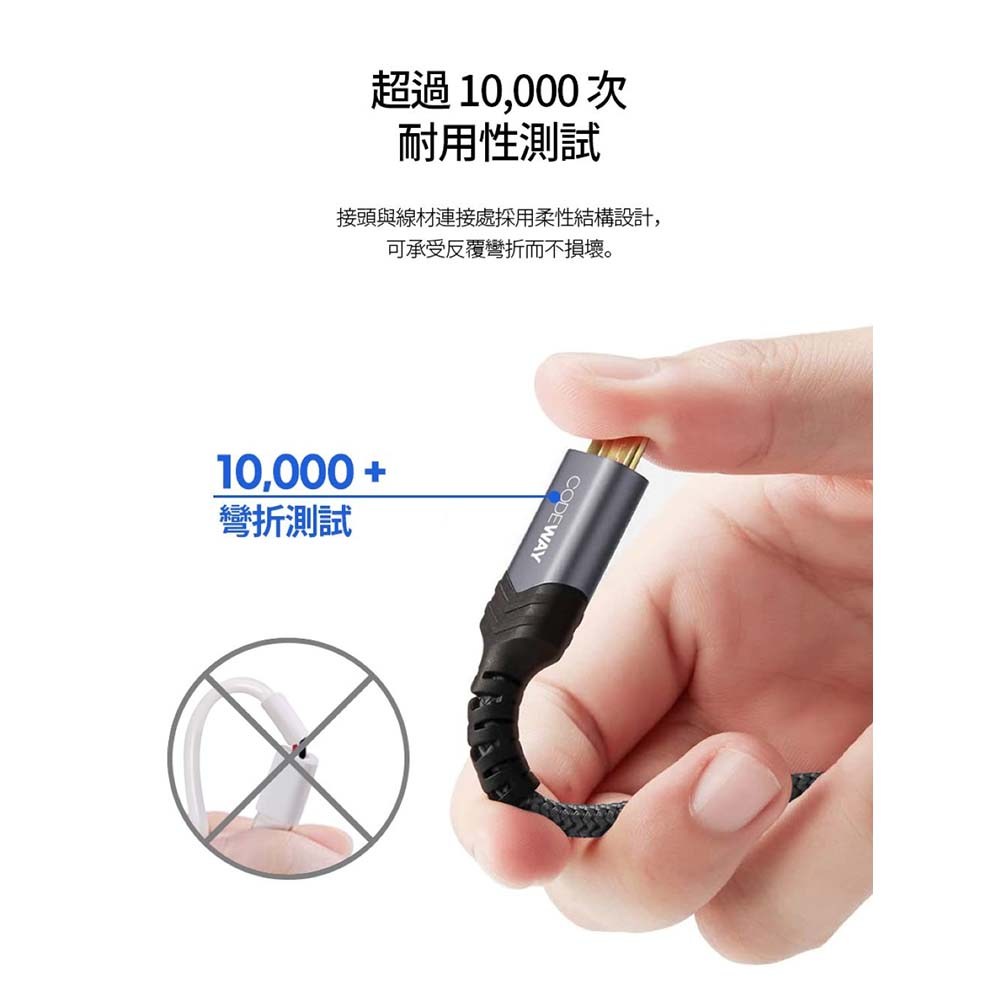 - CODEWAY傳輸線採用高強度編織尼龍外層,耐彎折且不易損壞,確保長期使用。