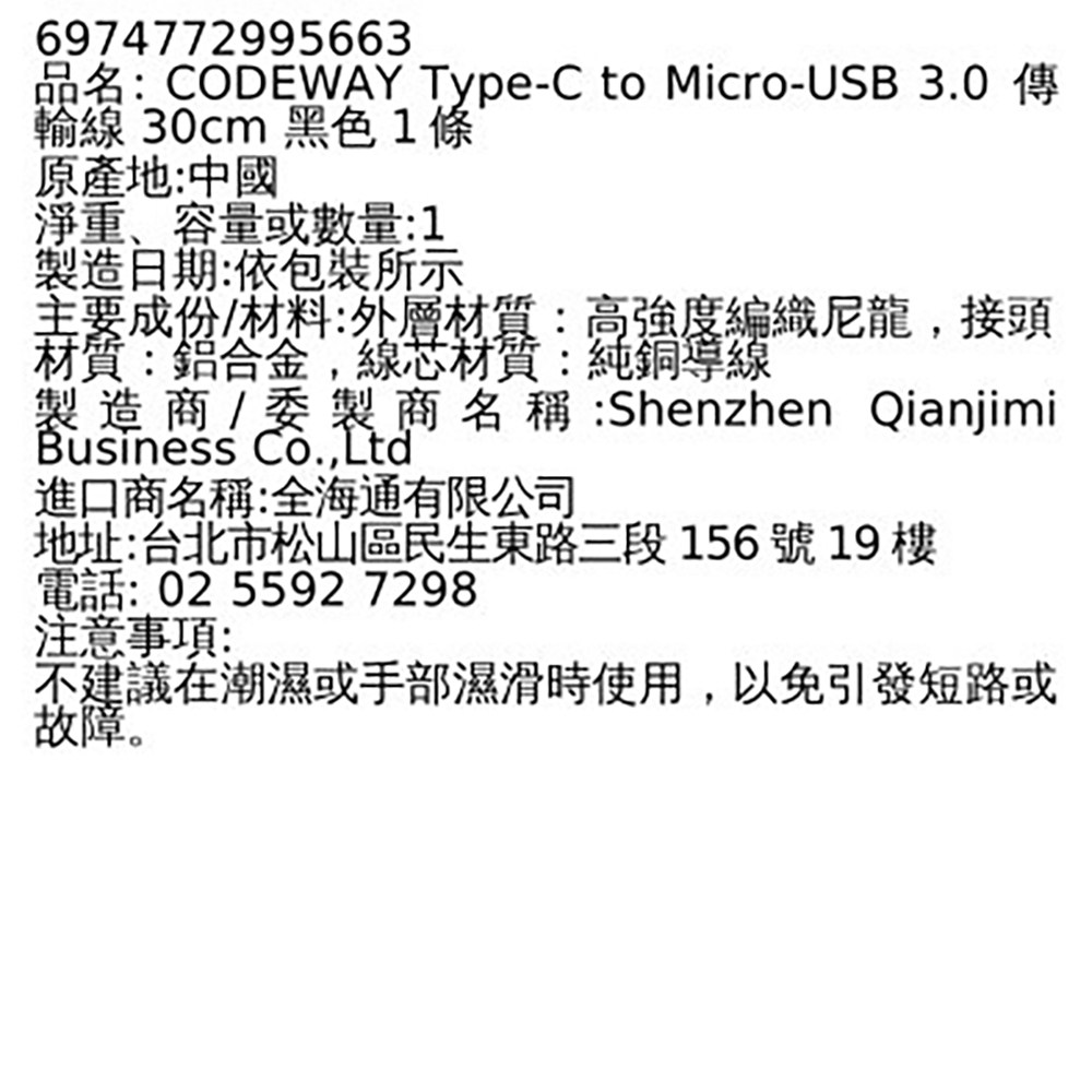 CODEWAY Type-C to Micro-USB 3.0傳輸線,採用高品質材料製成,外層為高強度編織尼龍,接頭為鋁合金,線芯為純銅導線,確保耐用性和穩定性。支援最高3A快速充電和5Gbps高速資料傳輸,讓您快速充電和傳輸資料。56kΩ高阻值設計,提供穩定且安全的電力傳輸,避免損害設備。一體成型接頭和柔韌結構設計,經過超過10,000次彎折測試,極致耐用。適用於連接各種支援Type-C和Micro-USB 3.0接口的數位裝置,如手機、平板、外接硬碟等。