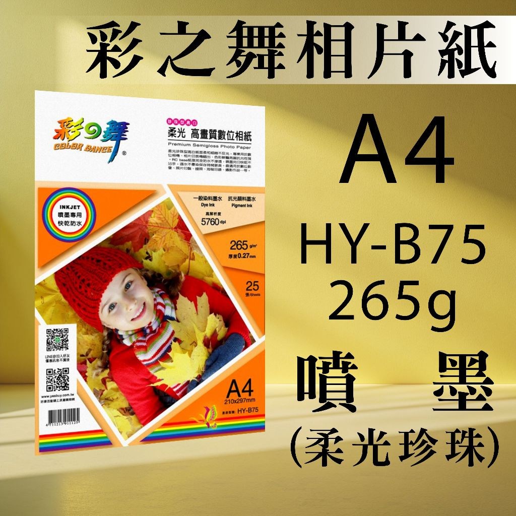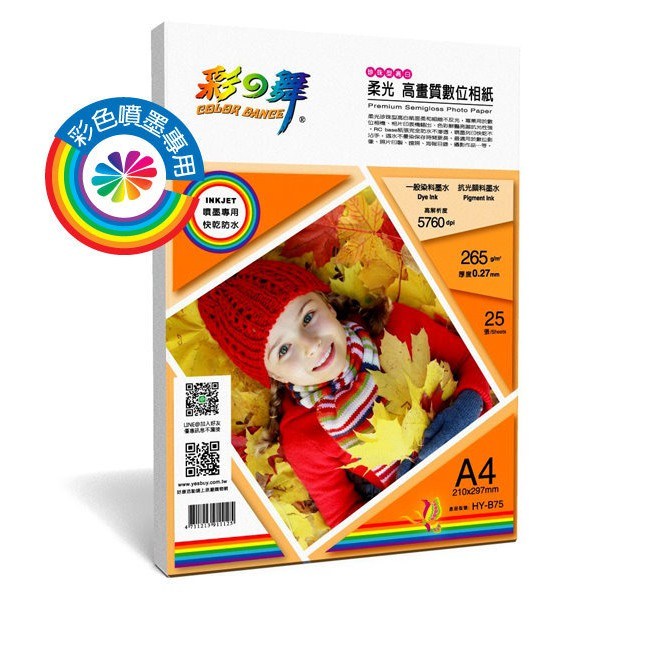 COLOR DANCE 彩之舞 RC珍珠面高畫質數位相紙 防水 265克重 HY-B75 25張, A4(297 x 210 x 厚度0.27mm)