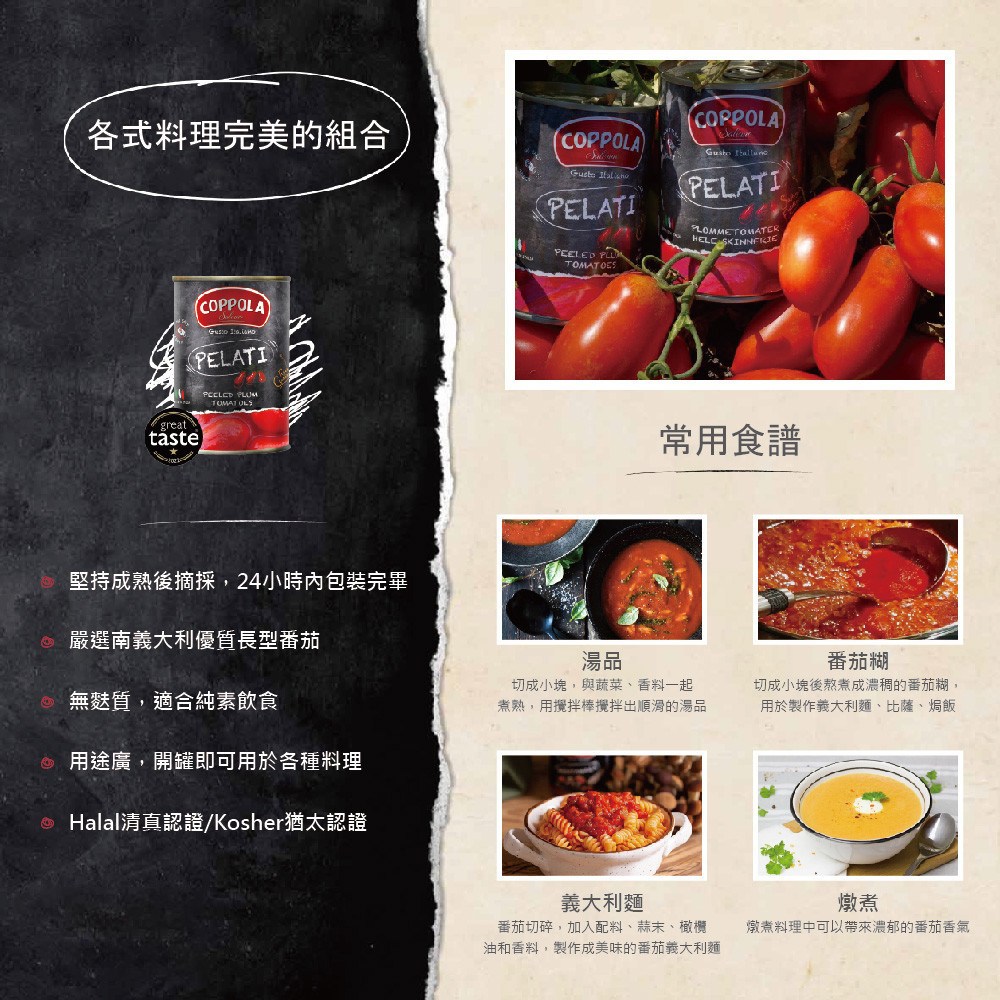 Coppola 天然無加鹽去皮整粒番茄,選用義大利優質番茄,不添加鹽分,保留番茄最原始的風味。每罐400g,方便烹調各式料理,如義大利麵、燉飯、湯品等。Coppola 番茄採用傳統工藝製作,確保每一顆番茄都飽滿多汁,口感豐富。無鹽配方更適合注重健康飲食的消費者,讓您輕鬆享受美味又健康的料理。無論是家庭聚餐還是個人料理,Coppola 去皮整粒番茄都是您的最佳選擇。