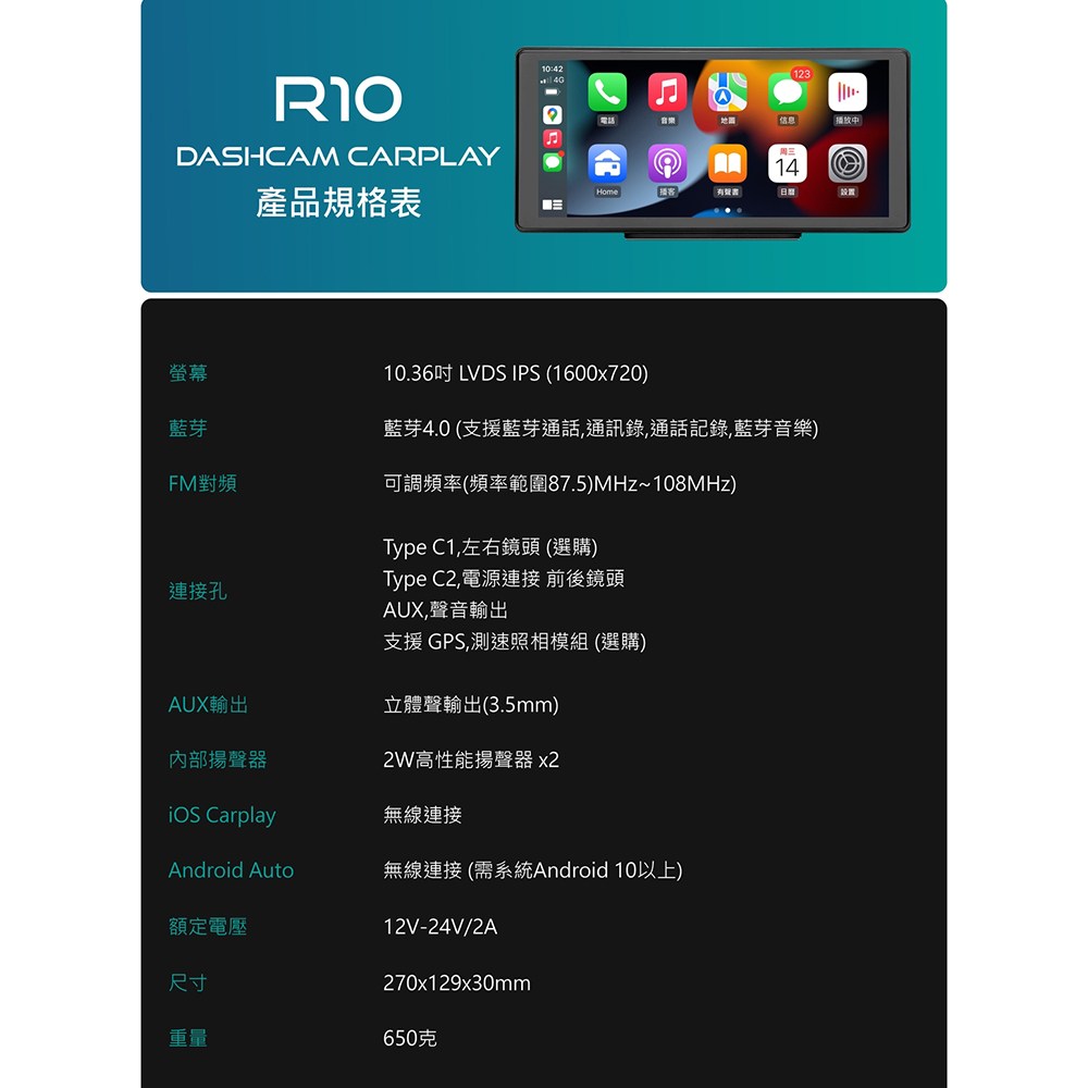 CORAL 四鏡頭 行車紀錄器 可攜式CarPlay R10 10.36吋, 512MB, 主機 + 前後鏡頭 + 延長線 + 左右鏡頭 + 1分2連接線 + 1分3連接線 + 車充線 + 支架 + 底盤 + 說明書 + 保固書 + 音源線