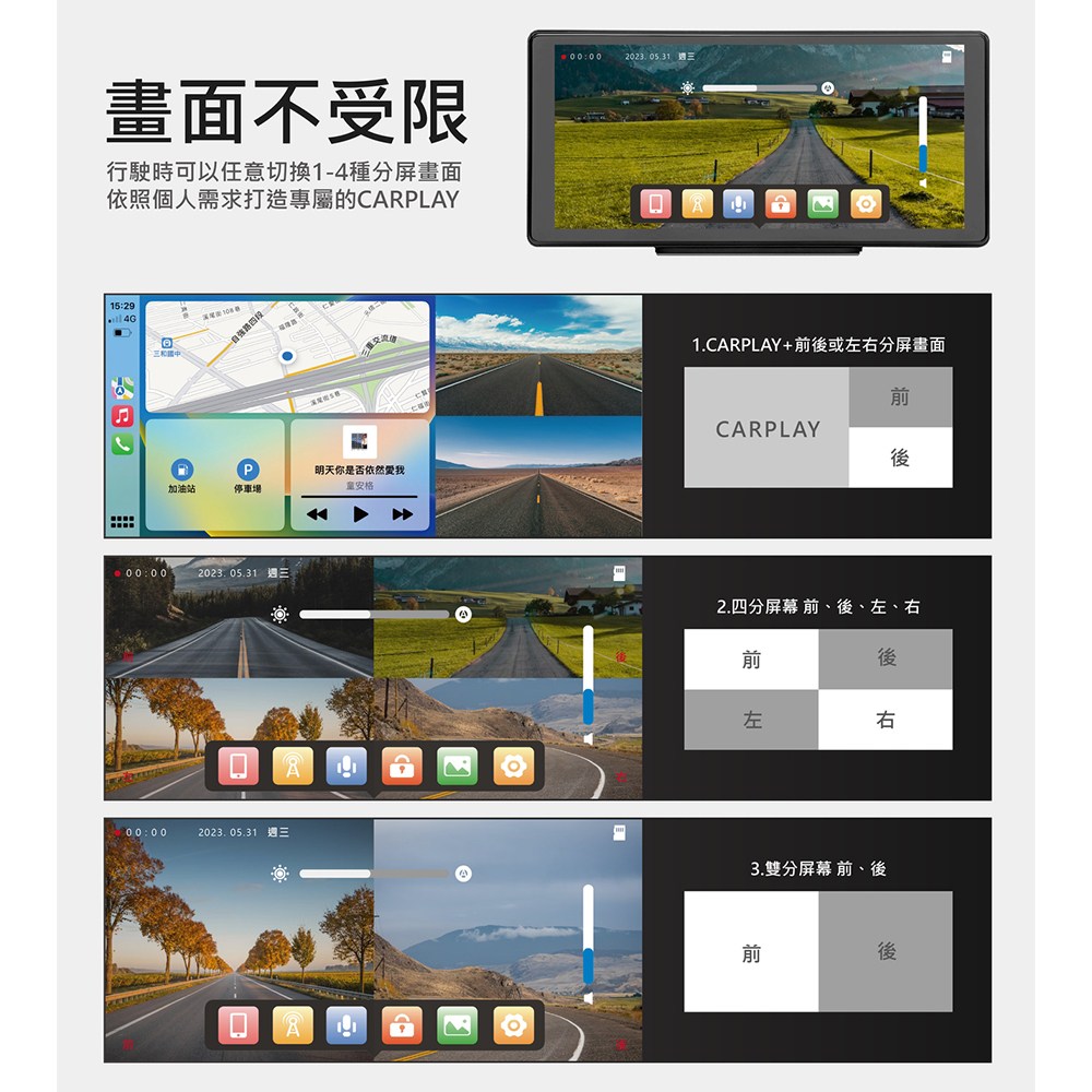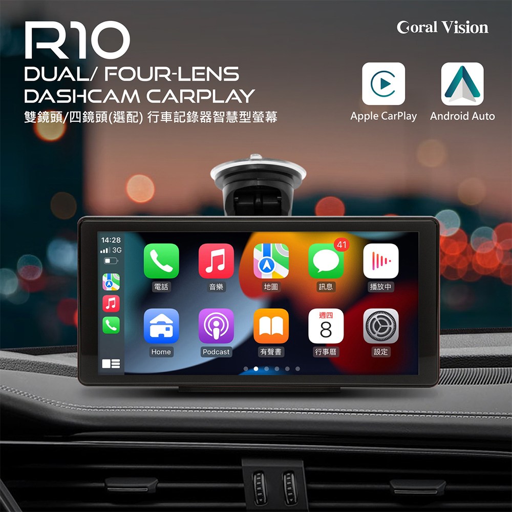 CORAL四鏡頭行車記錄器結合CarPlay功能,提供10.36吋大螢幕,讓您在行車時享受更清晰、更寬廣的視野。這款行車記錄器支援無線Apple CarPlay和Android Auto連接,讓您輕鬆使用手機導航、音樂、電話等功能。免拆機設計讓安裝更簡便,語音控制功能則提升駕駛安全。四鏡頭同時記錄車輛前後左右畫面,提供全方位的行車保障。此外,倒車顯影功能讓您在倒車時更加安全。