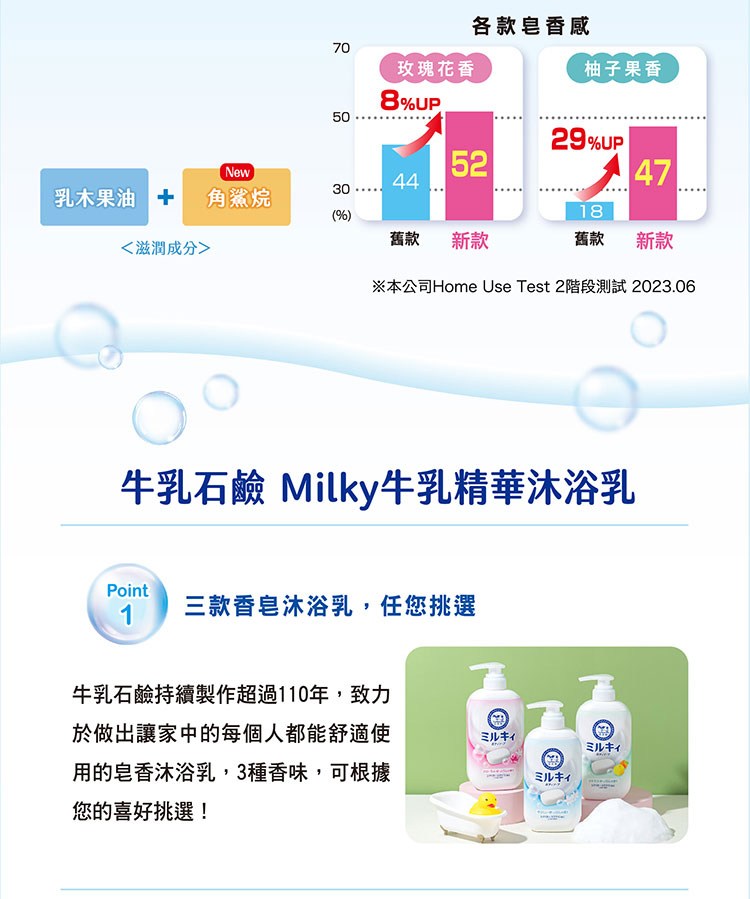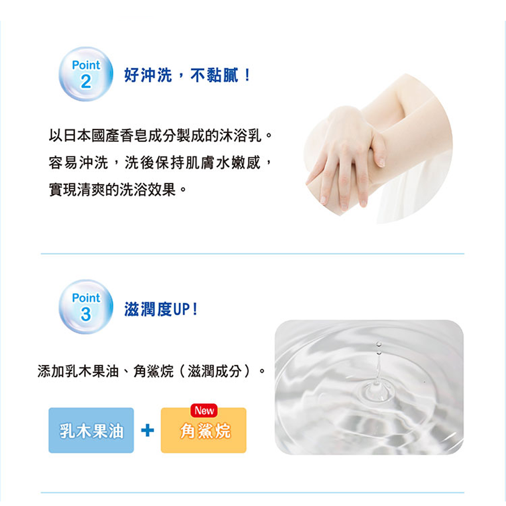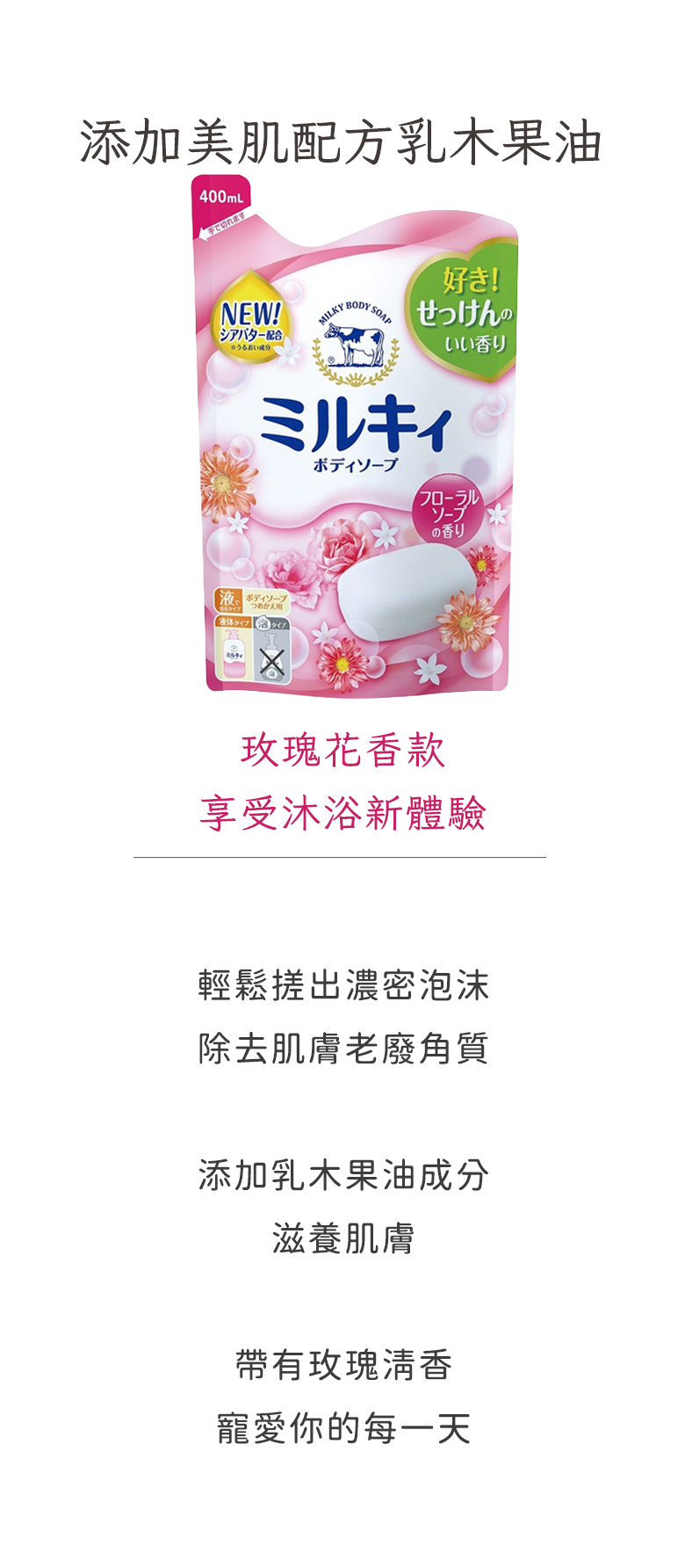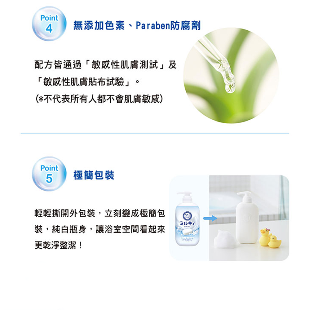 - 添加牛乳精華,深層滋潤乾燥肌膚,讓肌膚水嫩透亮,散發健康光澤,告別乾燥。