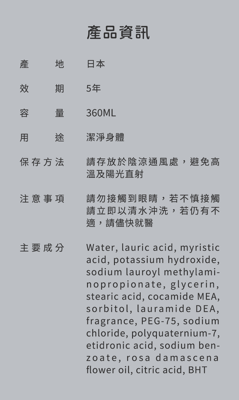 - 豐富綿密的泡沫,溫和潔淨肌膚,輕鬆帶走污垢與老廢角質,洗後肌膚柔嫩光滑。