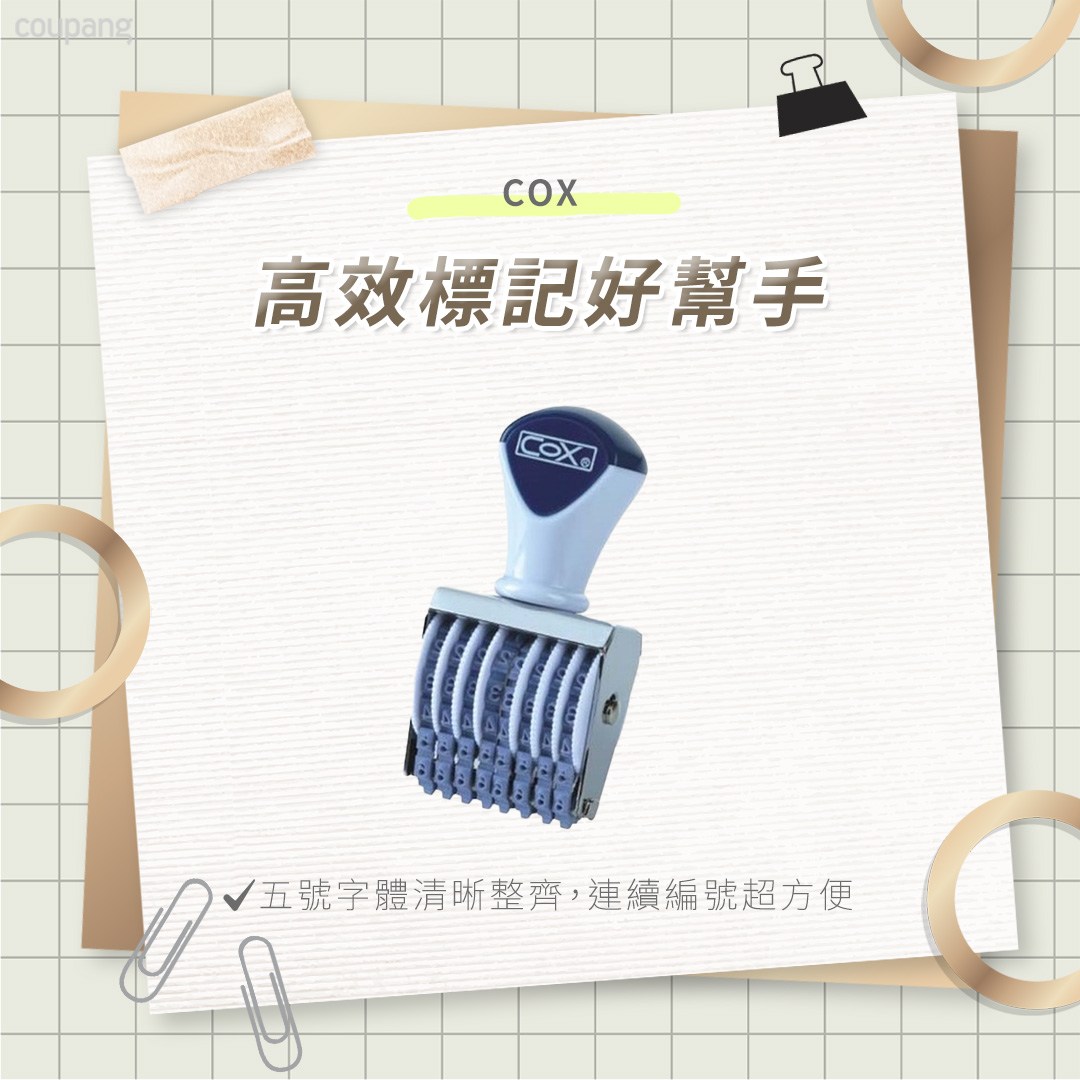 COX 五號八連號碼印是一款實用且多功能的辦公用品。它採用八連號碼設計,可以輕鬆變換數字,滿足不同的編碼需求。五號字體清晰易讀,蓋印效果精準,確保每次使用都能呈現專業級的品質。操作簡單方便,握感舒適,長時間使用也不易疲勞。適用於文件、票據、倉庫管理等多種場合,是提高工作效率的理想選擇。