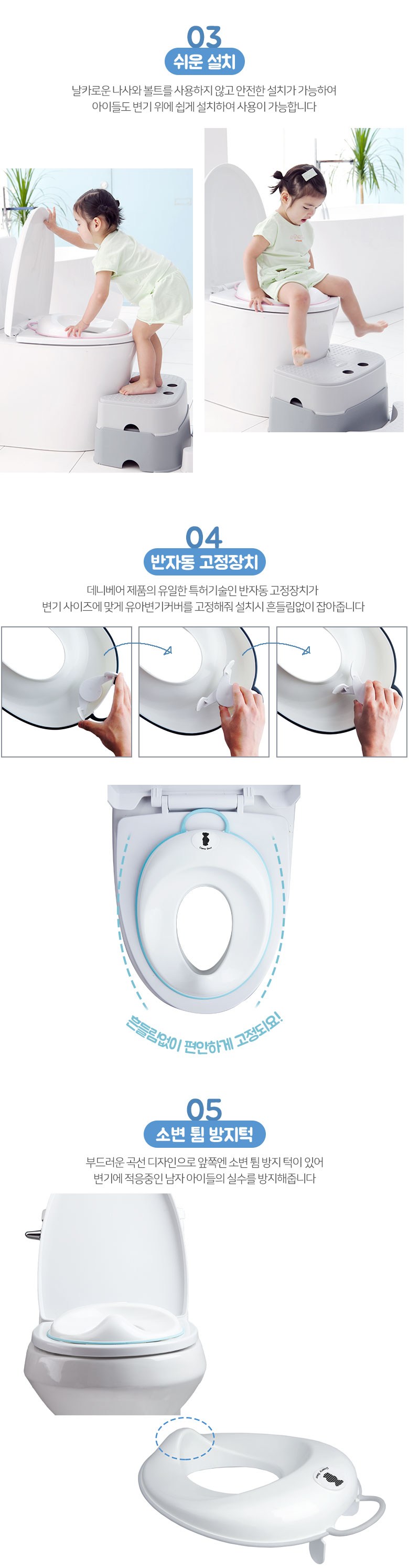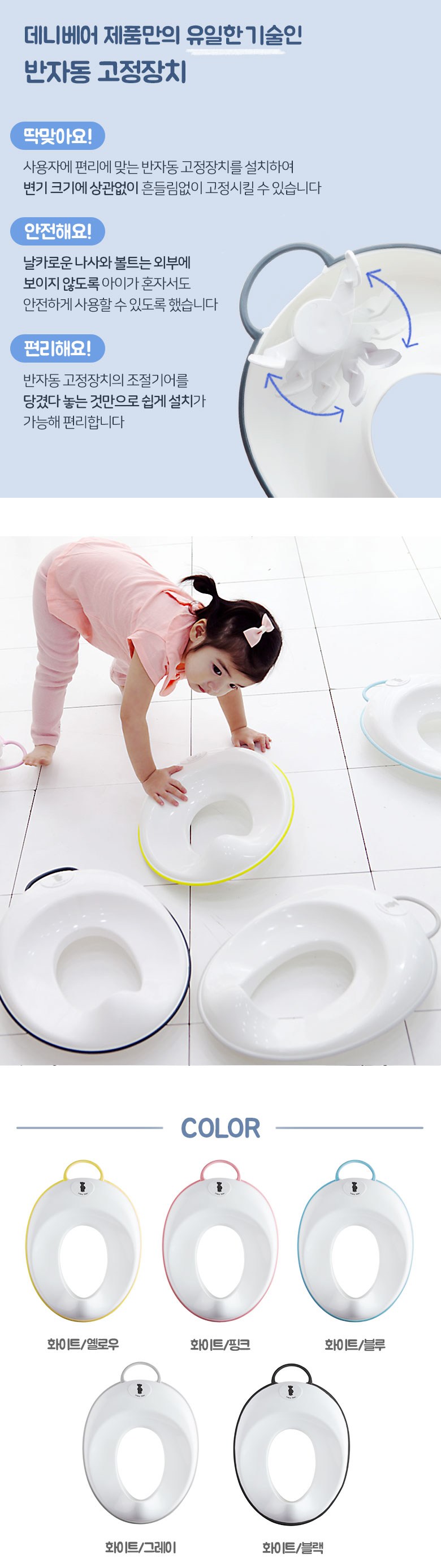 Denny Bear 智慧訓練幼兒馬桶坐墊採用半自動固定裝置,無需使用螺絲和螺栓,安裝簡單方便,輕鬆固定於馬桶上,不易晃動,讓寶寶使用更安全。