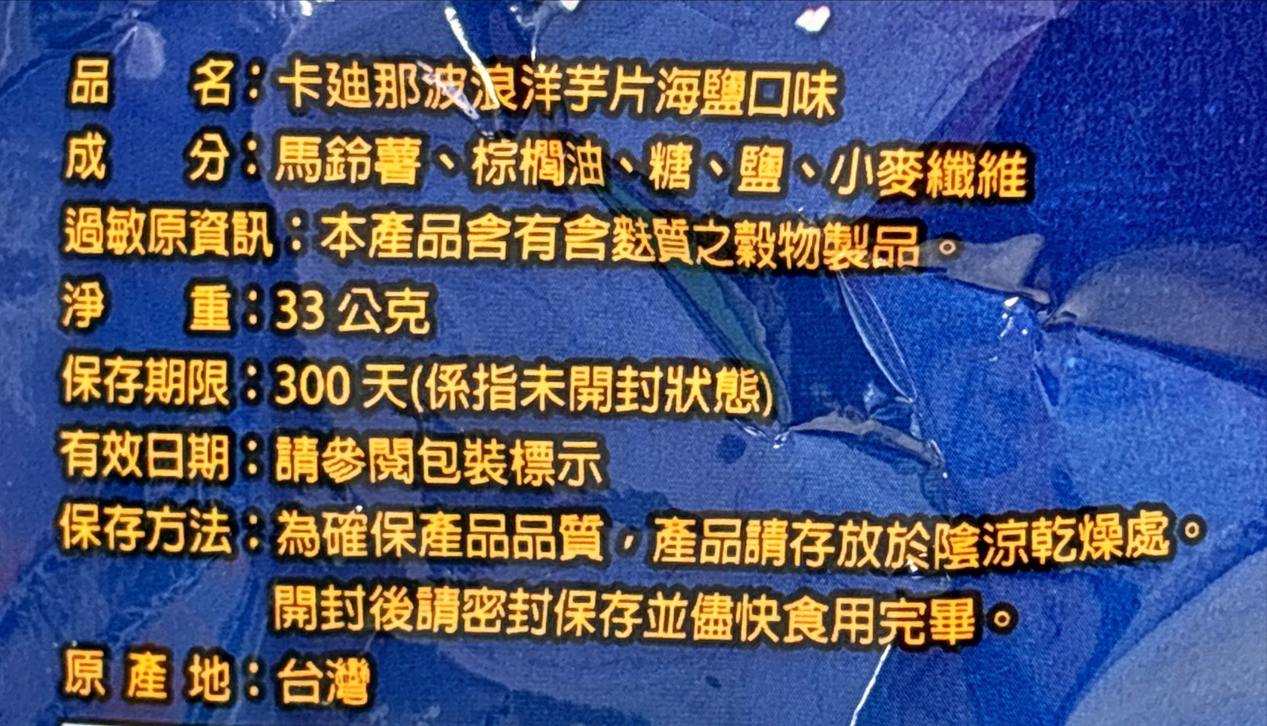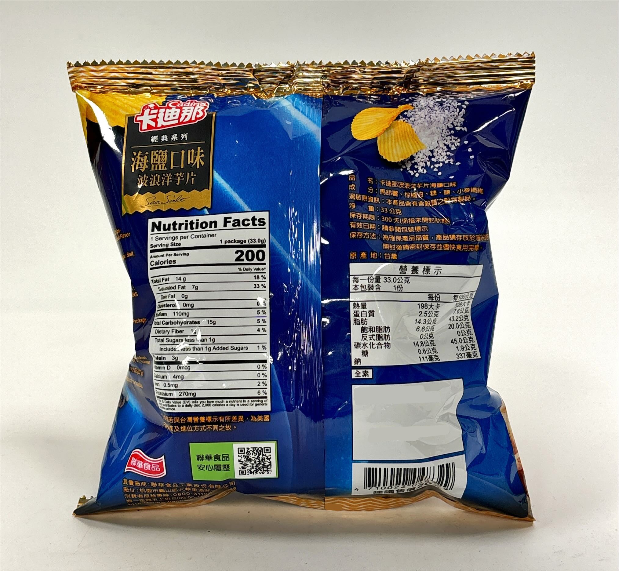 - 卡迪那海鹽口味洋芋片,酥脆口感在口中蔓延,帶來豐富的味覺享受。