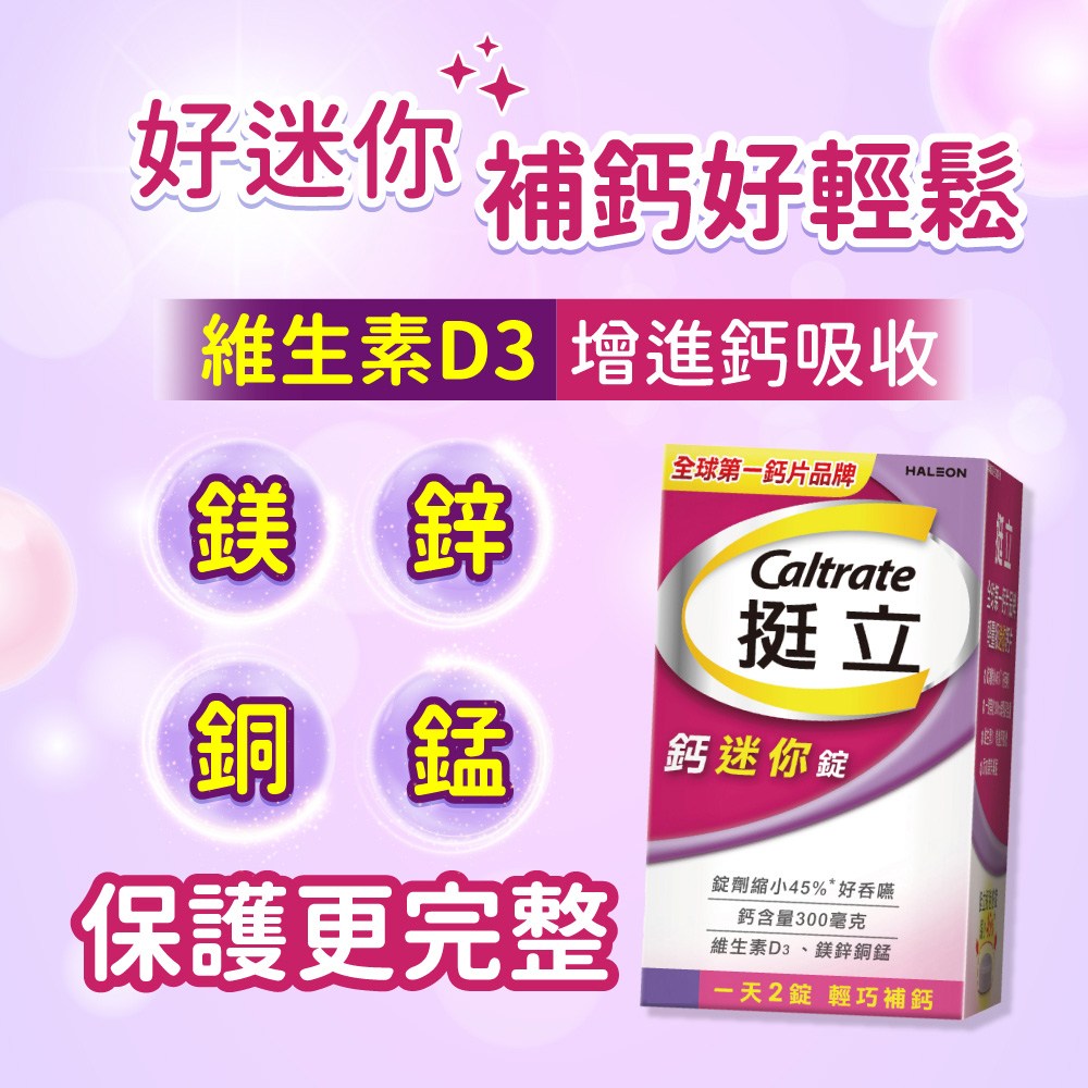 挺立鈣迷你錠,是您輕鬆補充鈣質的最佳選擇。迷你錠設計,告別吞嚥困難,每日只需兩錠,即可滿足身體所需的鈣質。添加維生素D3,有效促進鈣質吸收,讓您的骨骼更健康。此外,更添加鎂、鋅、銅、錳等多種礦物質,提供全方位的營養支持,守護您的健康。