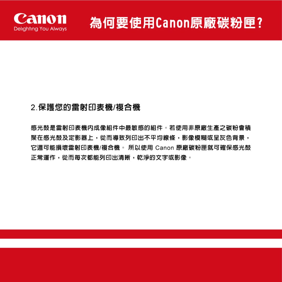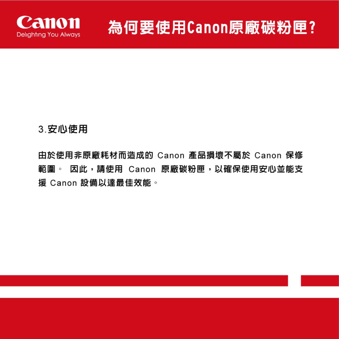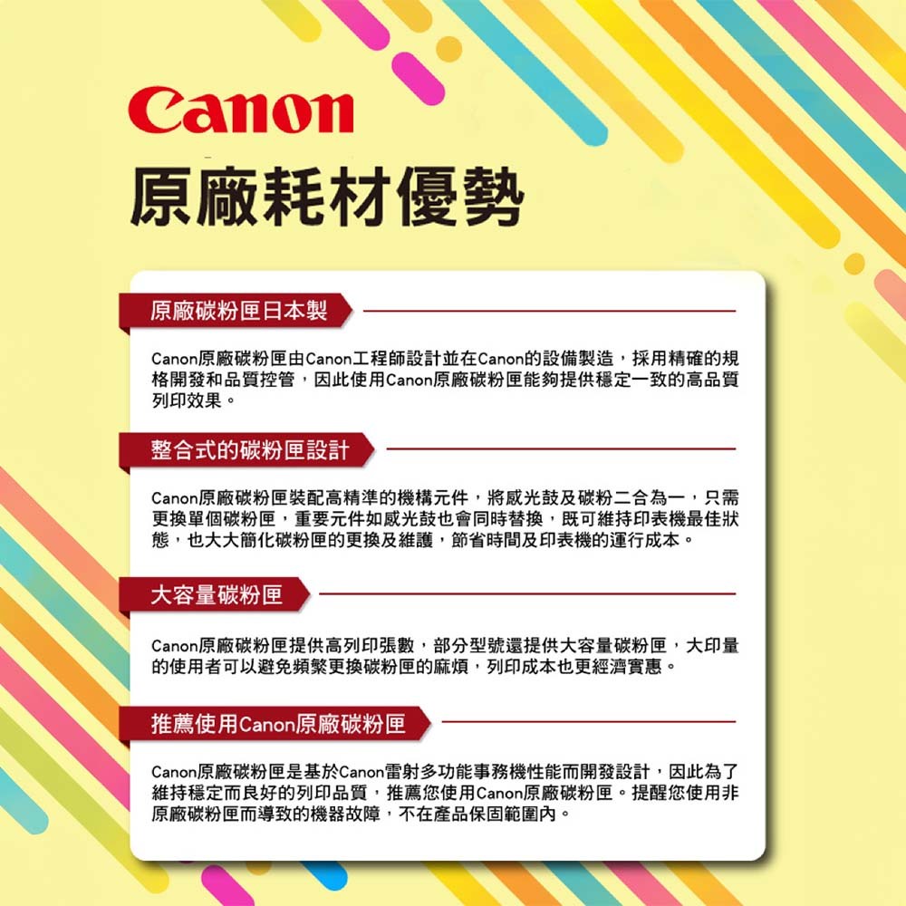 - 佳能原廠碳粉匣確保列印品質,色彩鮮明飽和,讓您的文件呈現專業級效果。