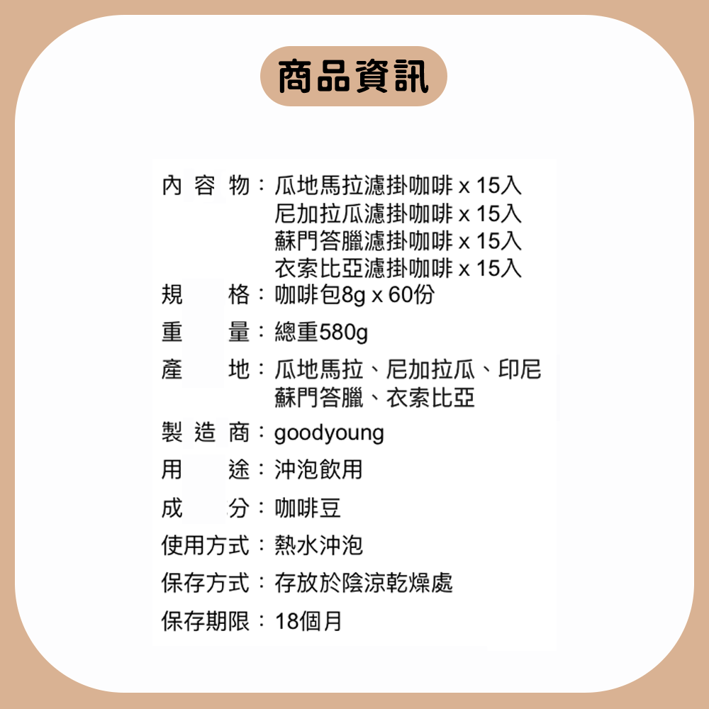 內容物: 瓜地馬拉 + 尼加拉瓜 + 蘇門答臘 + 衣索比亞 × 1盒