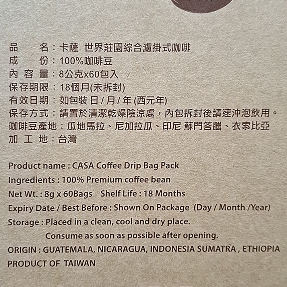 品嚐來自世界各地的咖啡風味,Casa 卡薩 世界莊園綜合綠掛式咖啡為您帶來一場味蕾的環球之旅。這款咖啡套裝包含60包獨立包裝的濾掛式咖啡,每包8克,讓您隨時隨地輕鬆享受一杯香醇的美式咖啡。精選來自瓜地馬拉、尼加拉瓜、印尼蘇門答臘、衣索比亞等知名產區的咖啡豆,每一口都充滿獨特的地域風味。無論是早晨的提神醒腦,還是午後的悠閒時光,Casa 卡薩 世界莊園綜合綠掛式咖啡都是您的理想之選。採用濾掛式設計,沖泡簡單方便,讓您在家也能輕鬆享受專業級的咖啡體驗。