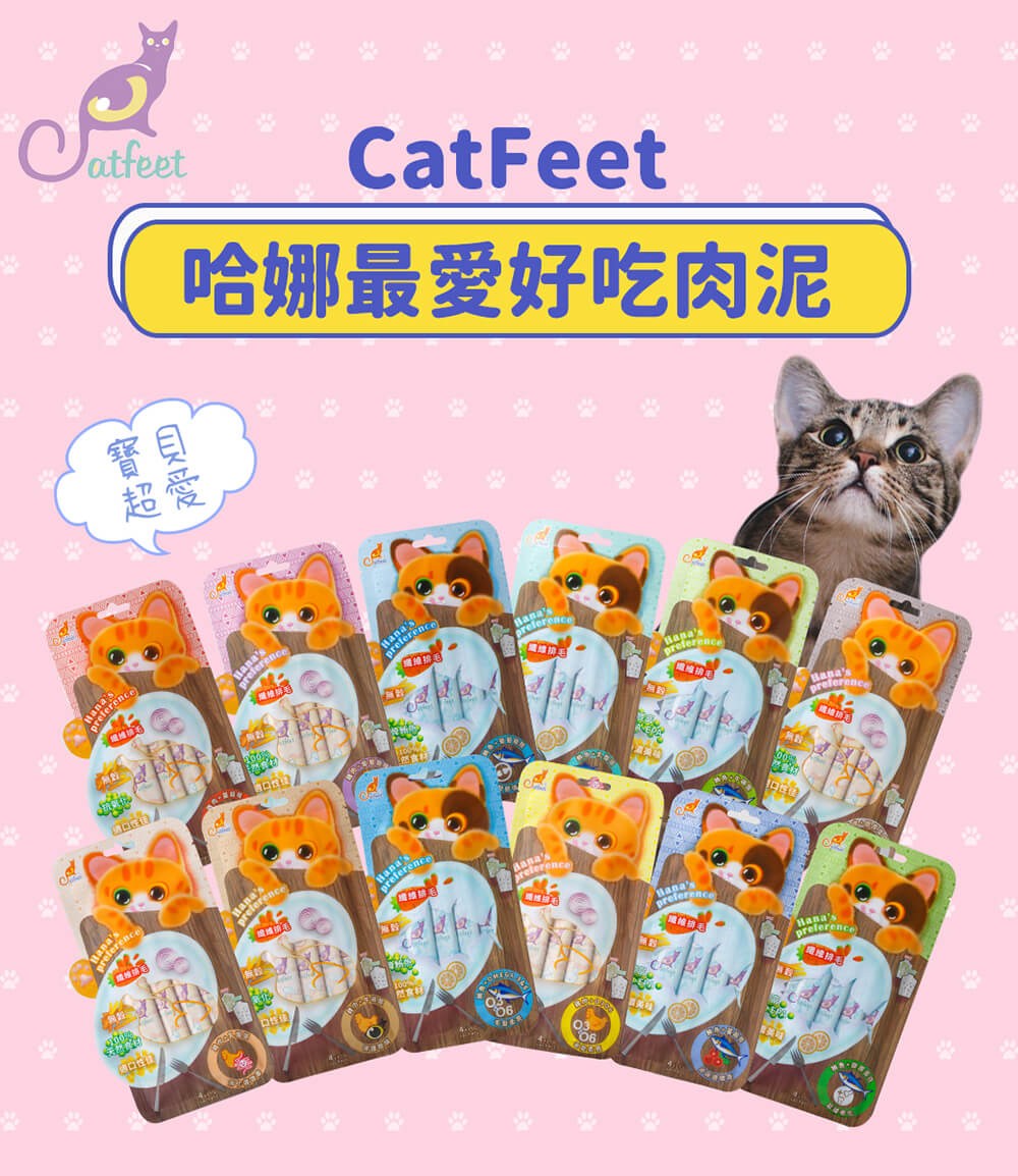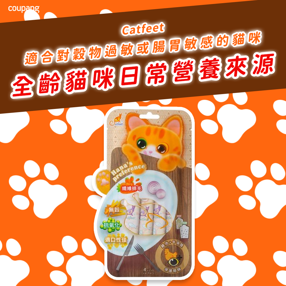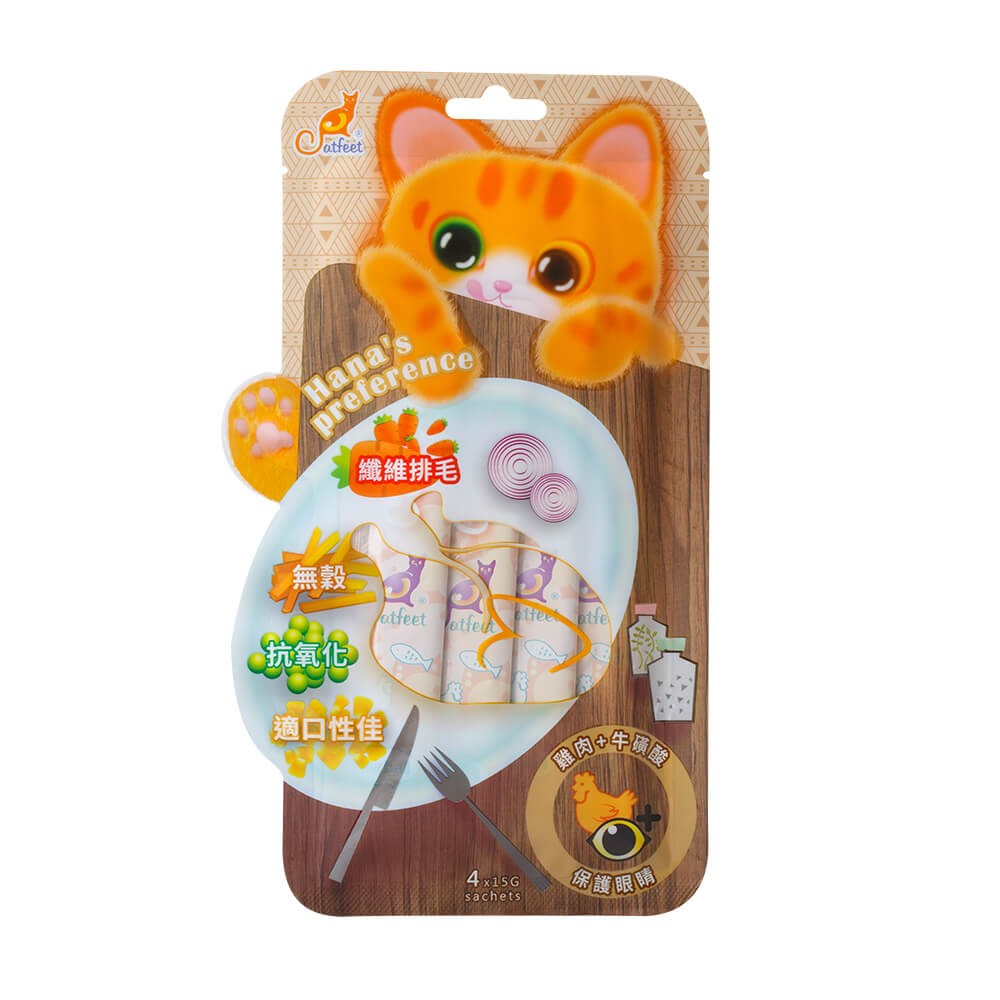 CATFEET 哈娜最愛好吃肉泥 雞肉+牛磺酸+化毛 是一款專為貓咪設計的美味營養補充品。這款肉泥以優質雞肉為基底,提供豐富蛋白質,並特別添加牛磺酸,有助於維護貓咪的視力、心臟及整體健康。此外,配方中還含有化毛成分,能有效幫助貓咪排出毛球,減少腸胃負擔。獨立包裝設計,方便餵食,一次一包,確保新鮮衛生。無論是直接餵食,或是搭配乾糧增加風味,都能讓您的愛貓享受美味又健康的點心時光。