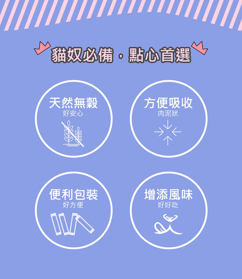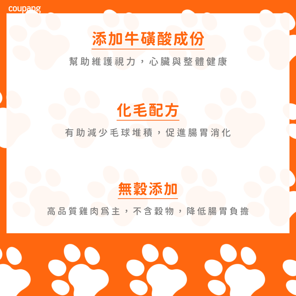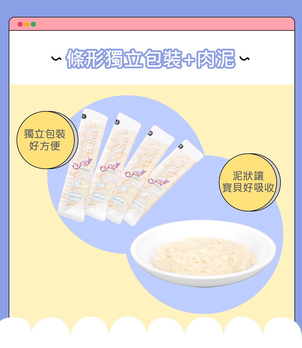 CATFEET 哈娜最愛好吃肉泥 雞肉+牛磺酸+化毛 是一款專為貓咪設計的美味營養補充品。這款肉泥以優質雞肉為基底,提供豐富蛋白質,並特別添加牛磺酸,有助於維護貓咪的視力、心臟及整體健康。此外,配方中還含有化毛成分,能有效幫助貓咪排出毛球,減少腸胃負擔。獨立包裝設計,方便餵食,一次一包,確保新鮮衛生。無論是直接餵食,或是搭配乾糧增加風味,都能讓您的愛貓享受美味又健康的點心時光。